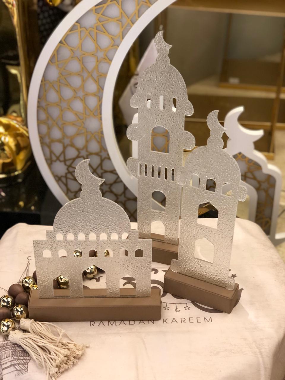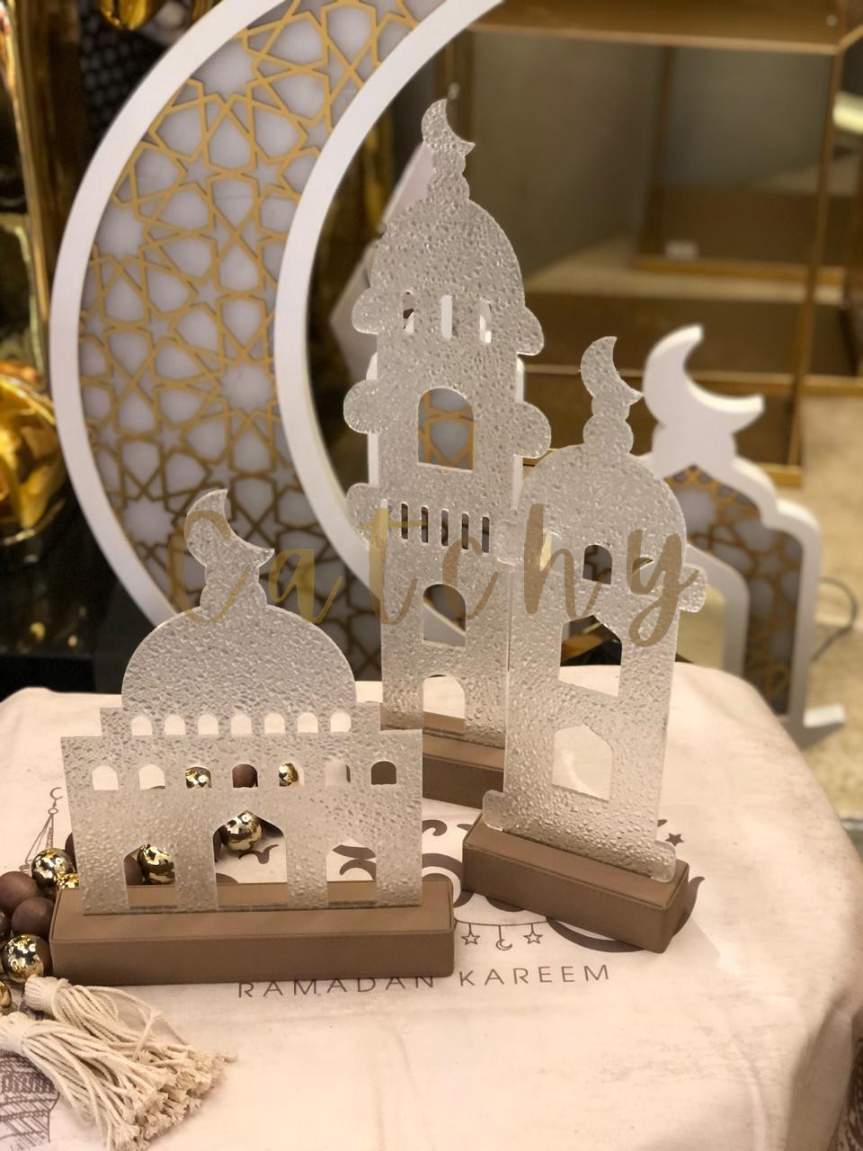 These images showcase a luxury acrylic and leather home decor collection that blends modern materials with cultural symbolism. The second image specifically features decorative silhouettes of mosques and minarets, suggesting these pieces may be part of a Ramadan or Eid themed collection.
