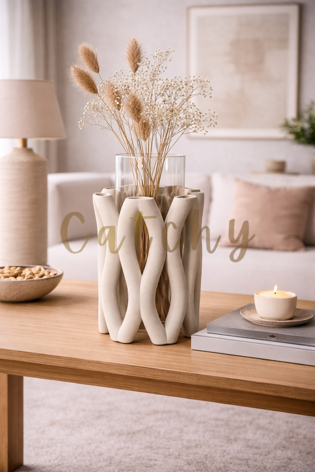A modern 3D-printed vase with a unique design, perfect for displaying flowers or adding a stylish decorative touch to any space.