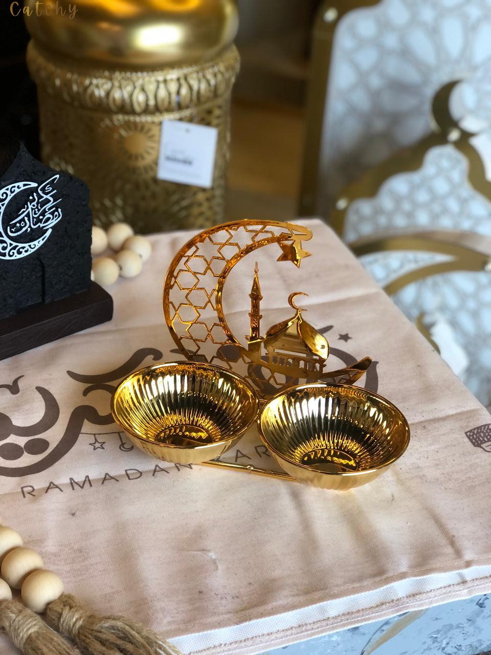 A beautifully designed Ramadan dates plate featuring a decorative crescent moon frame adorned with star and mosque silhouettes. The set includes two textured gold bowls, perfect for serving dates, nuts, or sweets during Iftar. Finished in an elegant gold tone, this piece doubles as a functional serving set and a festive decorative accent for your Ramadan table.