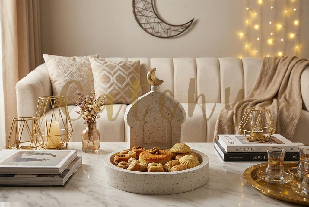 A beautifully designed Ramadan dates plate inspired by Islamic arch architecture, featuring a soft stone-effect bowl with a raised decorative back topped with a crescent moon finial. The subtle carved detailing and neutral tone create a calm, spiritual presence, making it perfect for serving dates, sweets, or nuts during Iftar while also acting as a decorative tabletop accent.