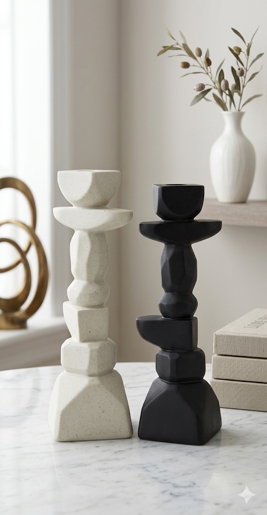 A bold decorative piece designed with a stacked geometric silhouette that adds strong visual impact to any space. Finished in a deep matte black tone, this sculptural form works beautifully as a statement décor accent or as a modern candle holder. Its architectural design makes it ideal for contemporary, minimalist, and artistic interiors.