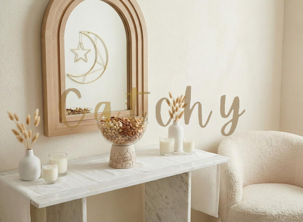 A delicate Ramadan dates plate designed with a clear glass bowl resting on a decorative base featuring subtle Islamic mosque motifs. The combination of transparent glass and soft gold detailing creates a light, elegant look, making it perfect for serving dates, nuts, or sweets during Iftar and Suhoor while adding a refined decorative touch to your table.