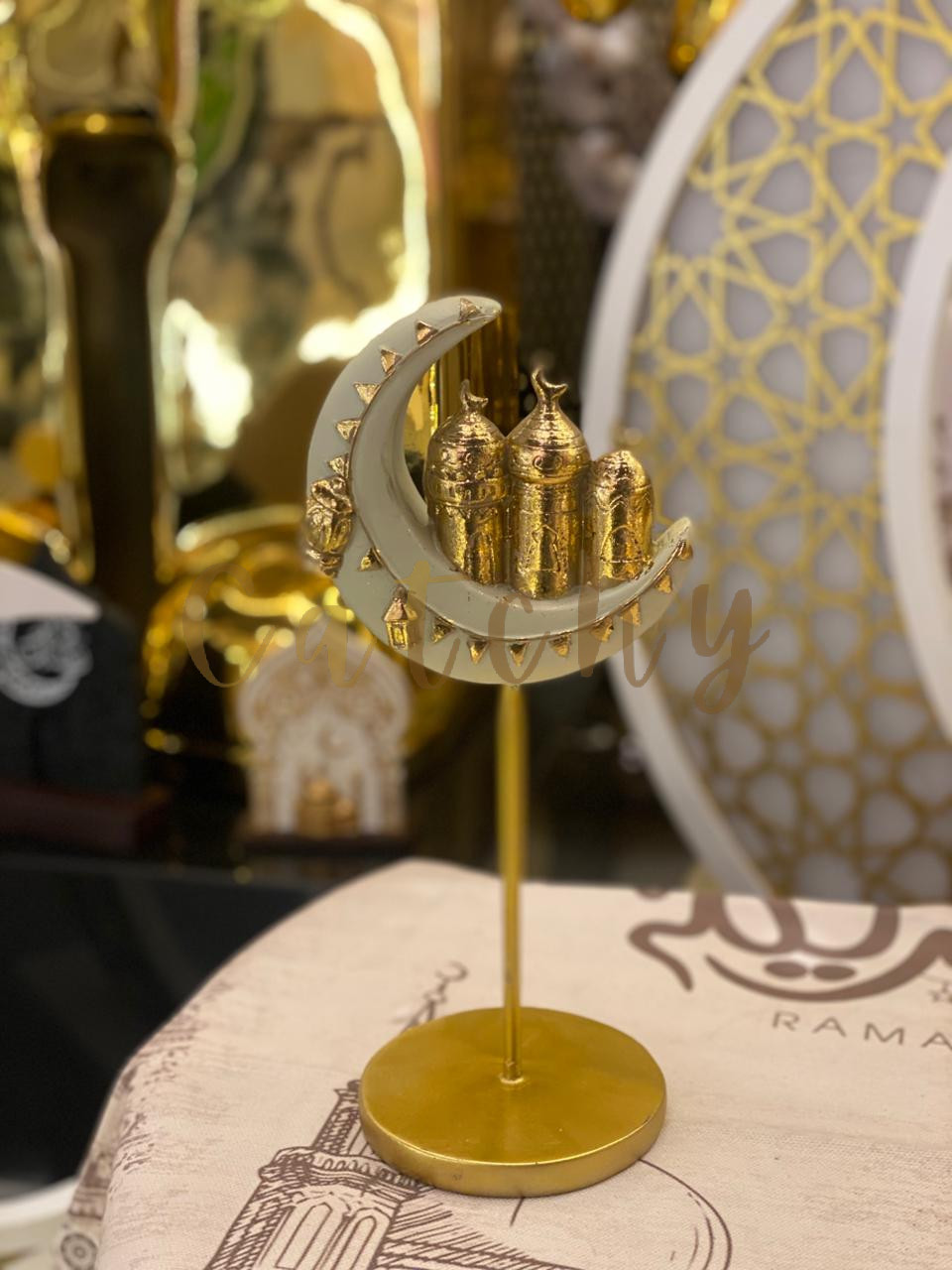 A graceful Ramadan decorative piece designed with a crescent moon silhouette embracing elegant mosque minaret details. Elevated on a slim stand with a round base, this décor accent adds height and sophistication to your Ramadan and Eid styling. Finished in a warm gold tone, it’s perfect for consoles, side tables, or as a focal point in festive arrangements.