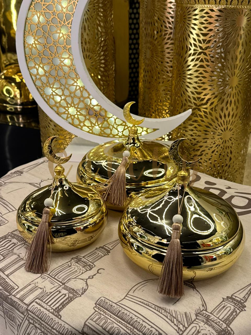 A luxurious Ramadan dates plate set designed to elevate your Iftar table with a rich, festive touch. Featuring clear glass bowls wrapped with elegant gold detailing and topped with crescent moon finials, this set beautifully reflects the spirit of Ramadan. Ideal for serving dates, nuts, or sweets, while also doubling as a sophisticated decorative accent for your table or console.