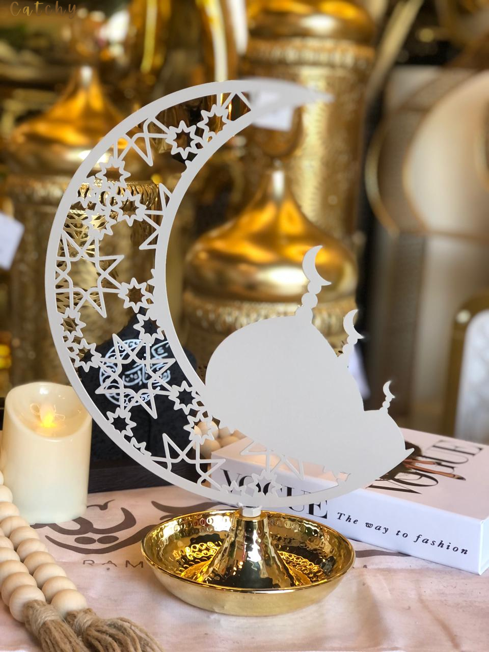 A luxurious Ramadan decoration set designed in elegant crescent moon silhouettes, beautifully detailed with intricate cut-out patterns and suspended Islamic motifs. Finished in a soft gold tone, these pieces create a warm glow and a refined festive atmosphere, making them perfect for Ramadan and Eid décor. Ideal for styling on consoles, side tables, or as a centerpiece in your festive arrangement.