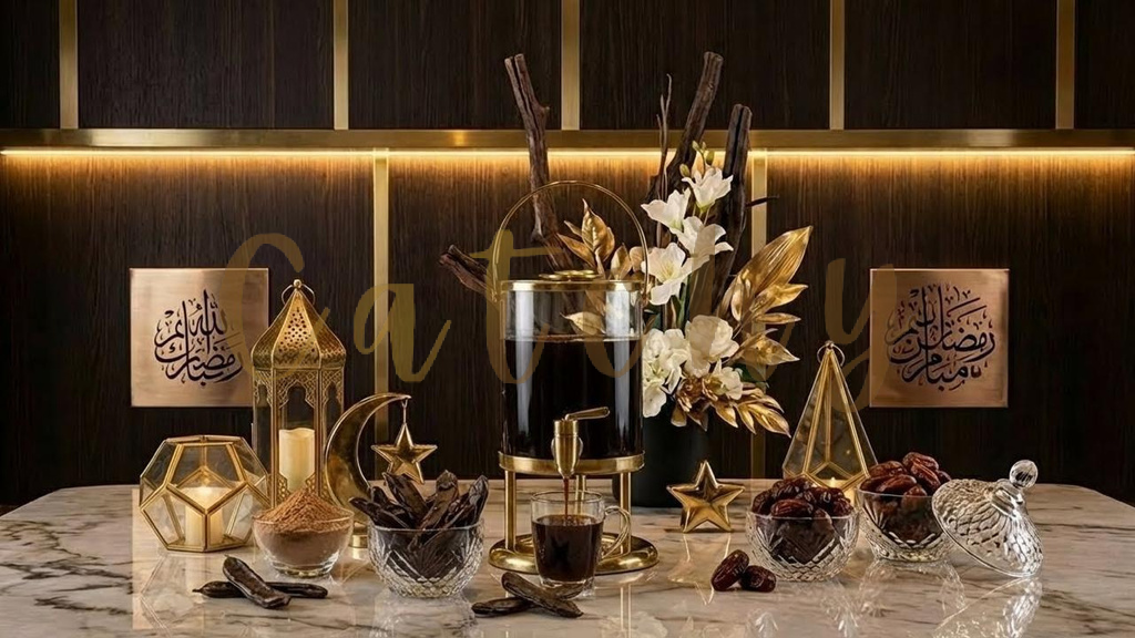 A luxurious Ramadan dispenser designed with a refined cylindrical silhouette, combining clear glass panels with elegant gold metal framing. The sleek structure and elevated base make it perfect for serving dates, sweets, or beverages during Iftar and Suhoor, while also adding a sophisticated decorative touch to your Ramadan table or console.