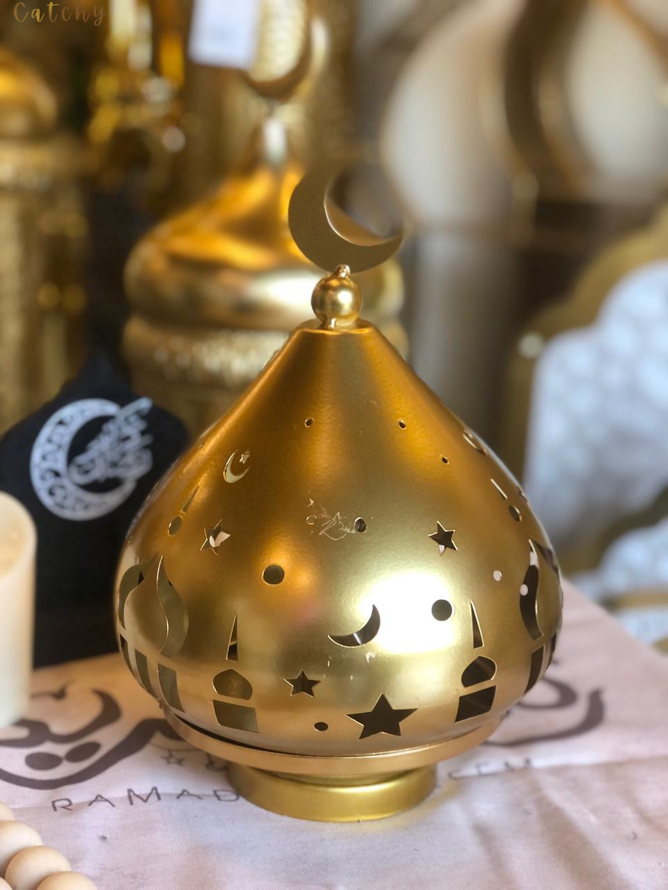 A luxurious Ramadan incense burner designed with a graceful domed silhouette and delicate star cut-out detailing. Finished in a rich gold tone and topped with a crescent moon finial, this piece allows incense smoke to gently rise while casting a warm, ambient glow. Perfect for creating a serene and festive atmosphere in living spaces or prayer corners during Ramadan and Eid.