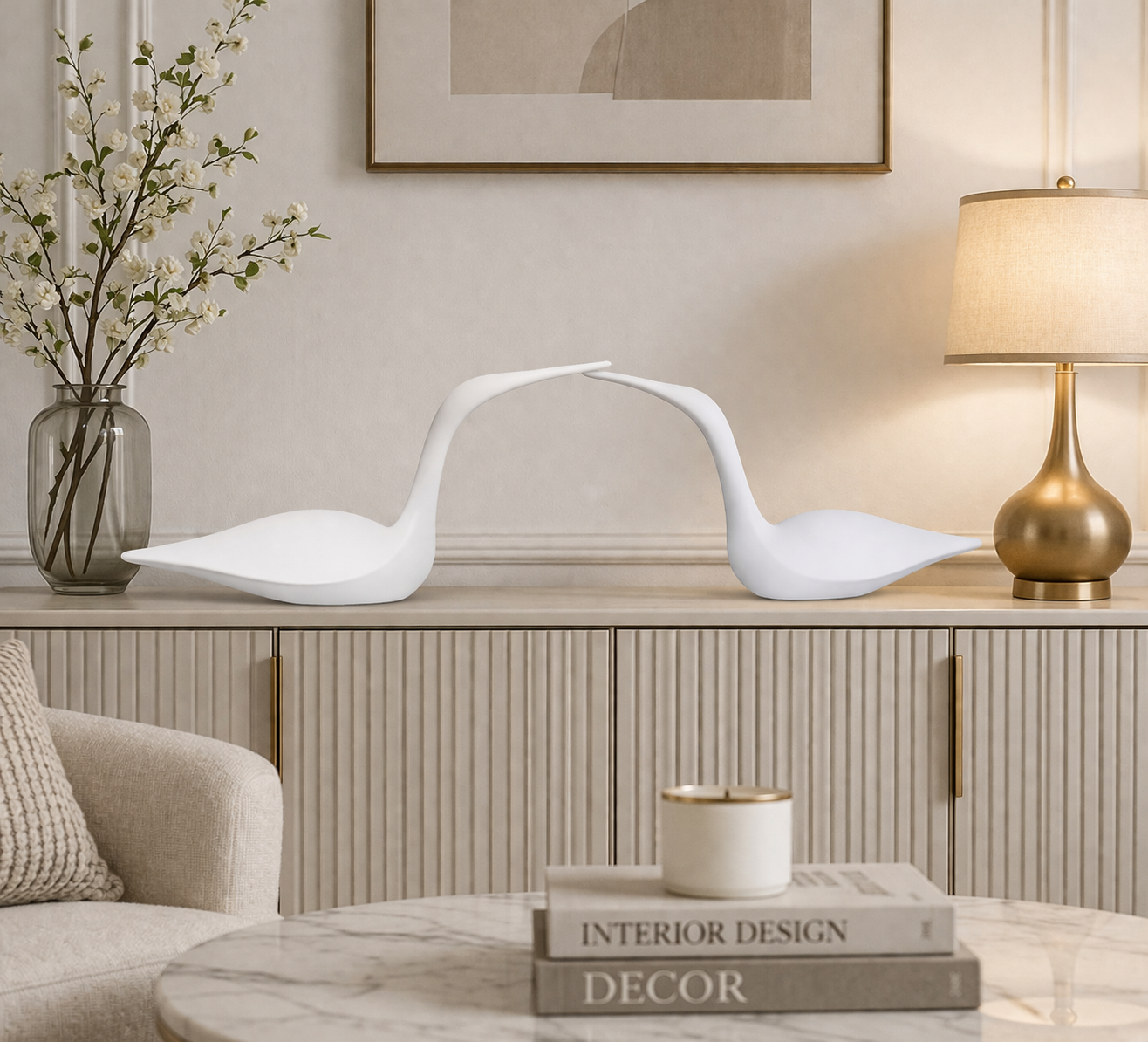A modern decorative sculpture designed with a fluid, abstract form that creates a sense of movement and balance. Featuring two smooth, elongated shapes connected in a graceful curve, this piece adds an artistic and contemporary touch to any space. Its clean white finish makes it ideal for minimalist, modern, and gallery-style interiors.