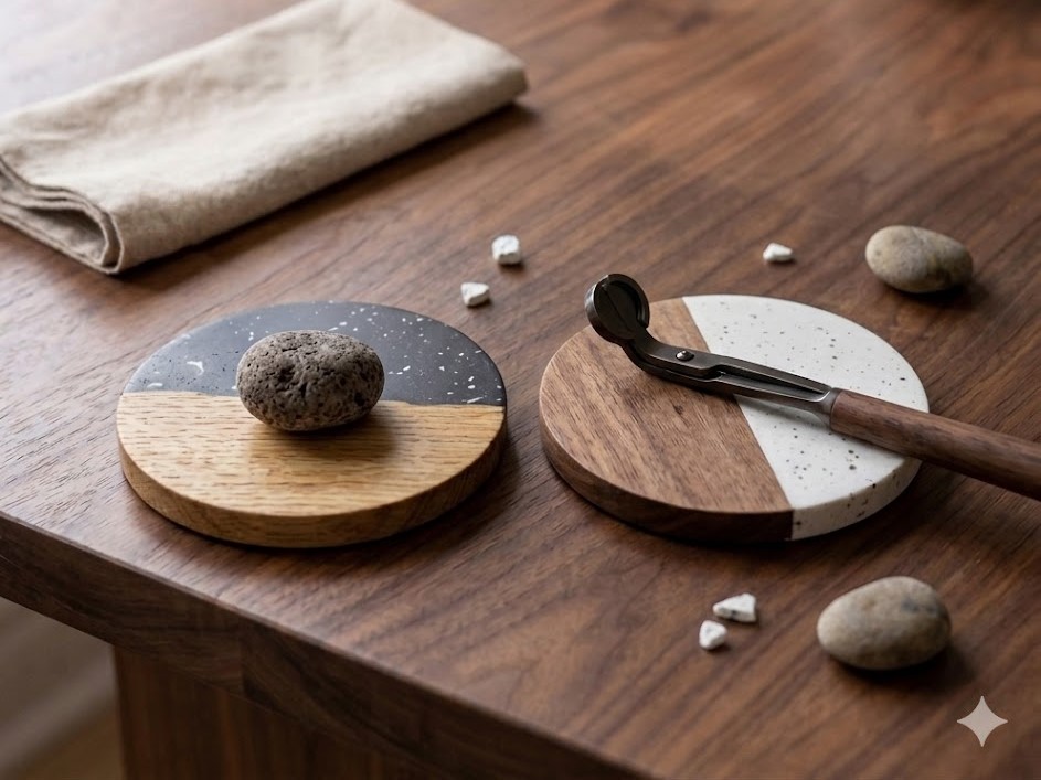 A modern set of decorative coasters designed with a stylish mix of natural materials and contrasting textures. Featuring a circular shape divided into wood and marble sections, these coasters add a contemporary, artistic touch to your table while protecting surfaces from heat and spills. Perfect for coffee tables, dining areas, or office desks.