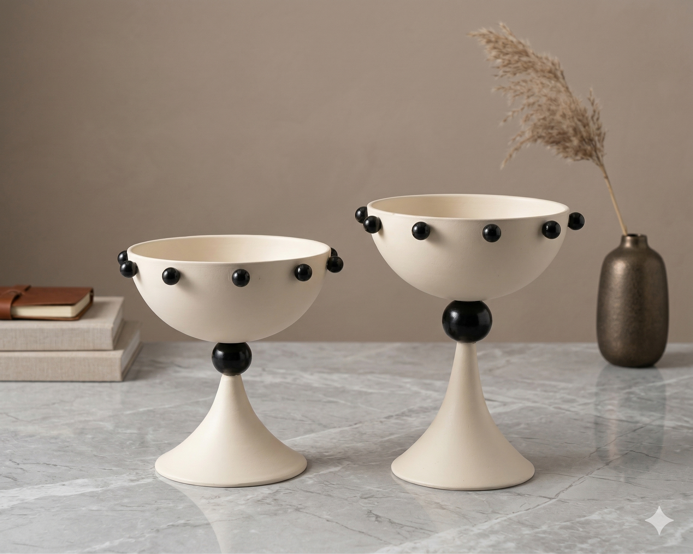 A playful yet elegant set of decorative bowls designed with a sculptural pedestal base and charming black bead accents along the rim. Finished in a soft neutral tone, these pieces add character and artistic flair to any space. Perfect for use as decorative bowls, small planters, or styling accents on consoles, shelves, or side tables.