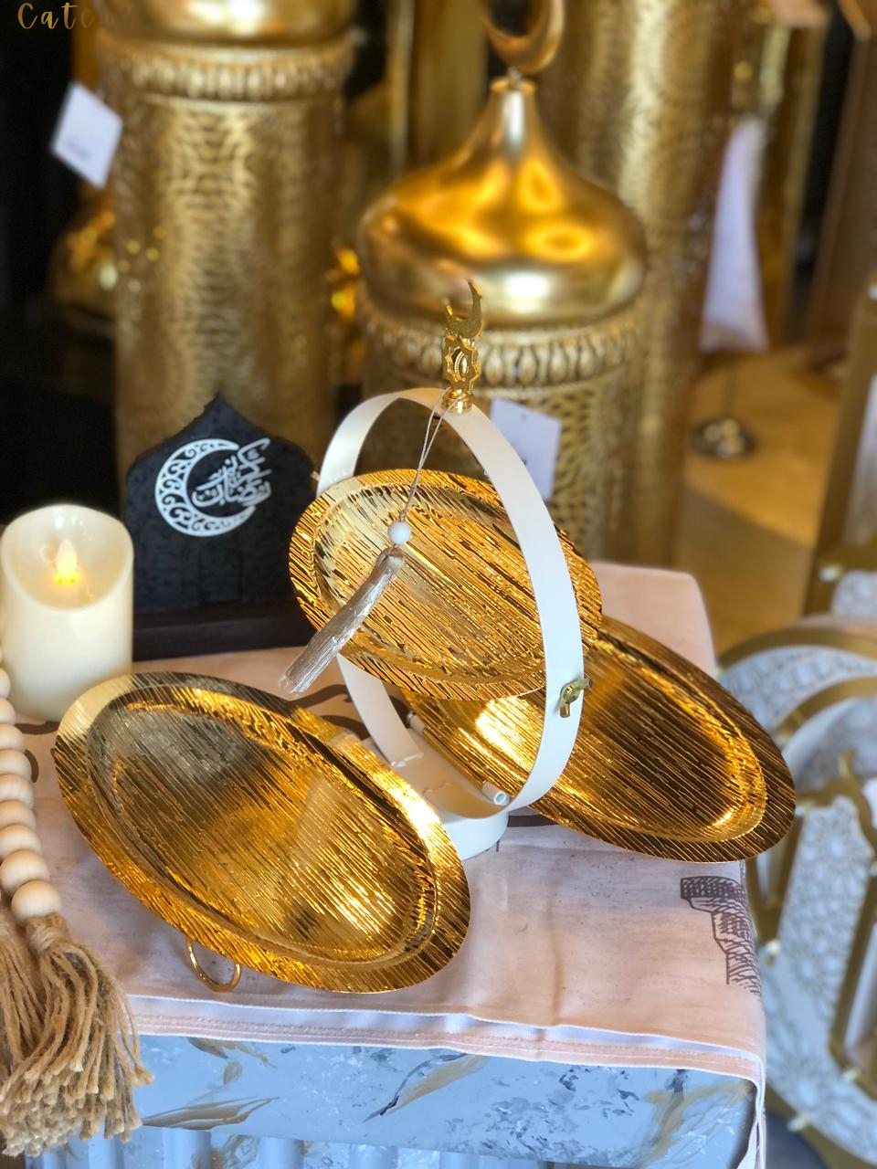 A sophisticated Ramadan tray designed with a modern, elegant silhouette, featuring a sleek oval form and a graceful curved handle for easy serving. Finished in a rich gold tone, this tray is perfect for presenting dates, sweets, or Arabic coffee during Iftar and Suhoor, while also serving as a stylish decorative accent for consoles or dining tables.