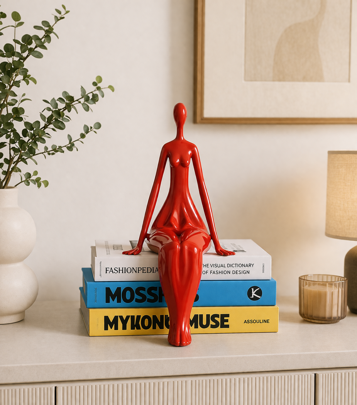 A striking contemporary sculpture featuring a stylized human figure seated on a transparent stool, designed to create a powerful visual statement. Crafted with a smooth, reflective finish, this piece plays with light and transparency, adding depth and artistic intrigue to any space. Perfect for modern interiors, galleries, or statement styling on consoles and shelves.