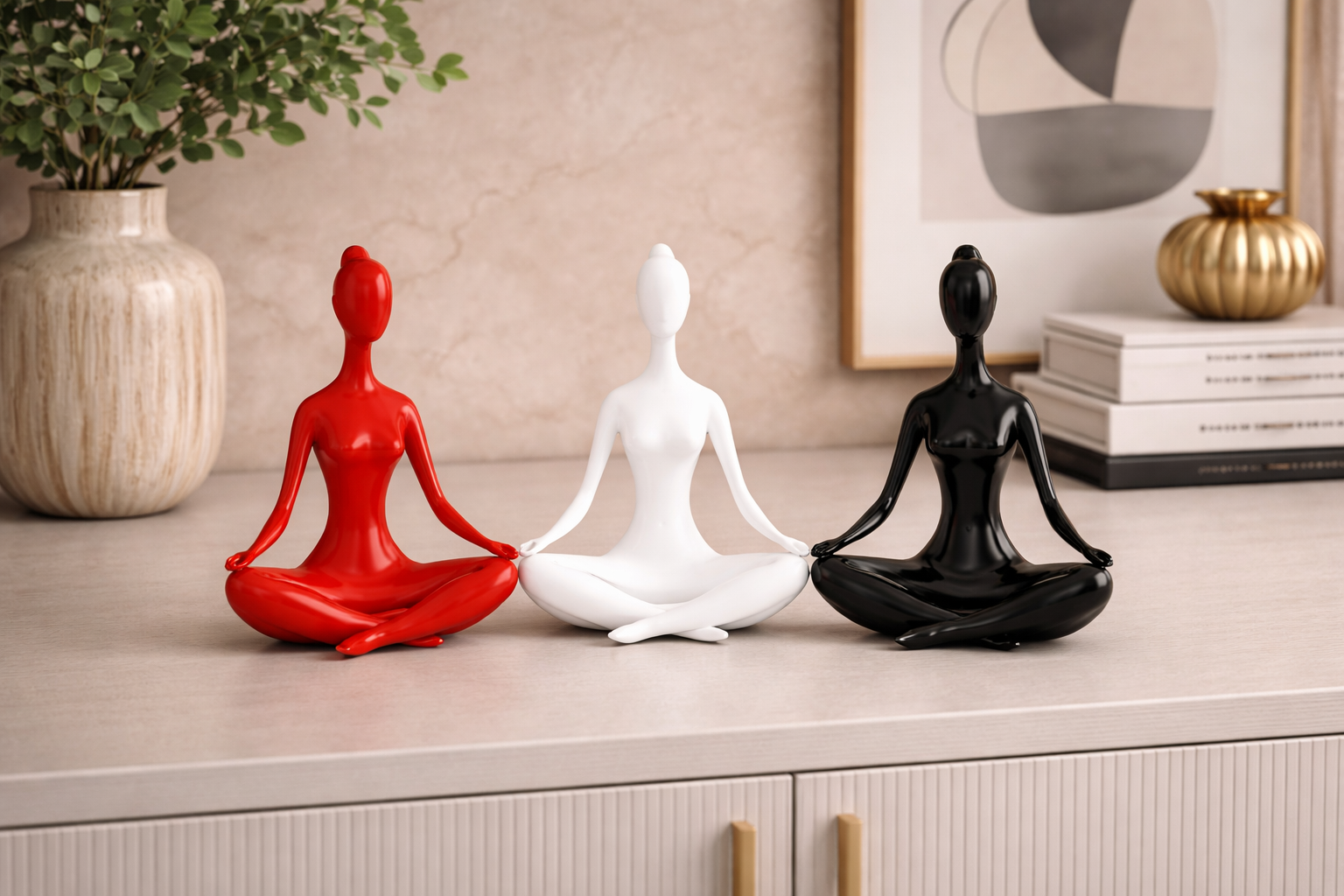 A striking set of decorative sculptures designed in a modern abstract human form, capturing elegance, balance, and artistic expression. Featuring smooth flowing lines and a seated pose, these pieces add a bold contemporary touch to any space. Available in classic black, white, and vibrant red finishes, they are perfect for styling on shelves, consoles, or desks.