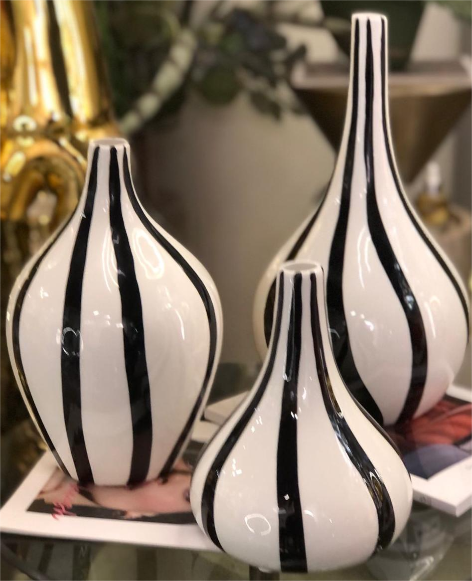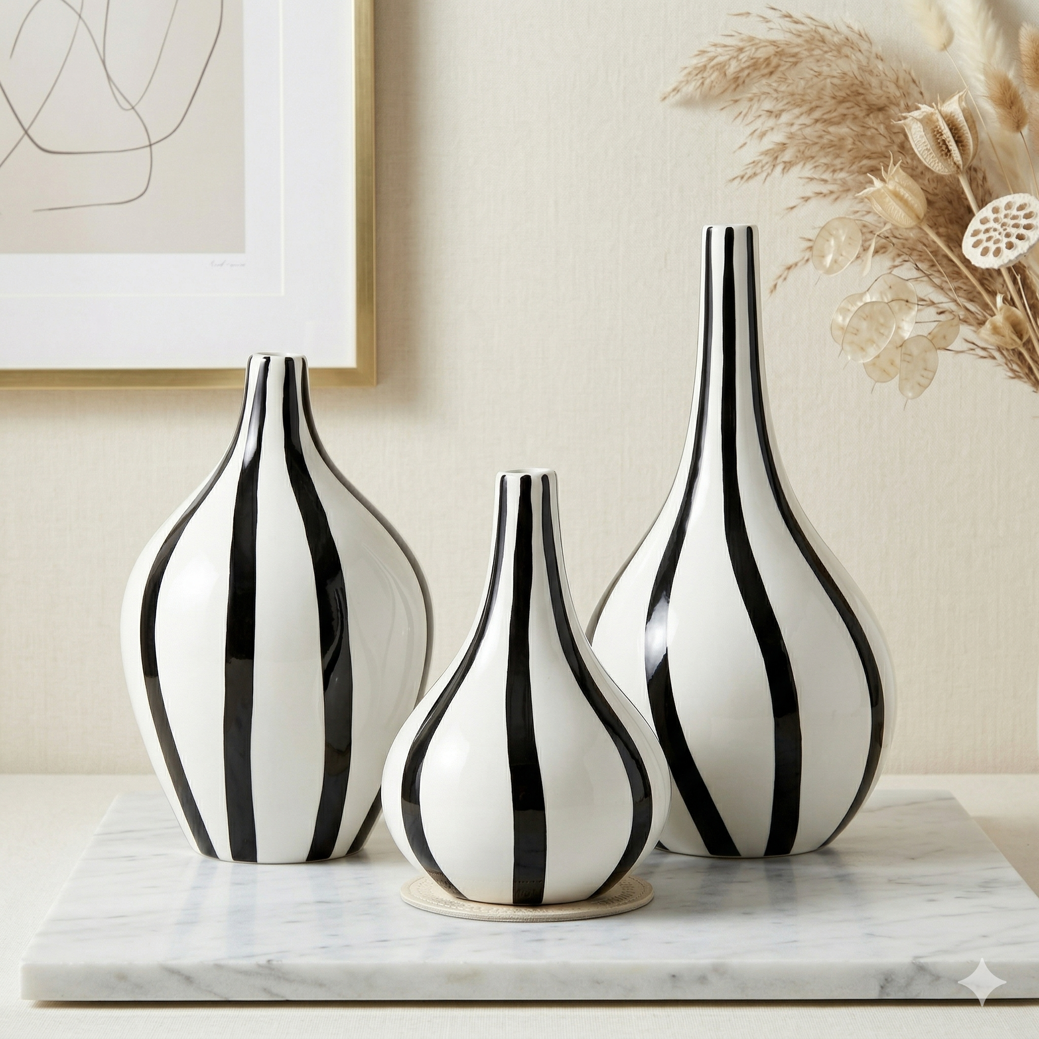 A striking set of decorative ceramic vases designed with elegant elongated silhouettes and bold black-and-white striped patterns. The glossy finish and flowing lines create a modern yet timeless look, making these vases perfect for statement styling on consoles, shelves, or side tables. Displayed together or individually, they add artistic contrast and sophistication to any interior.