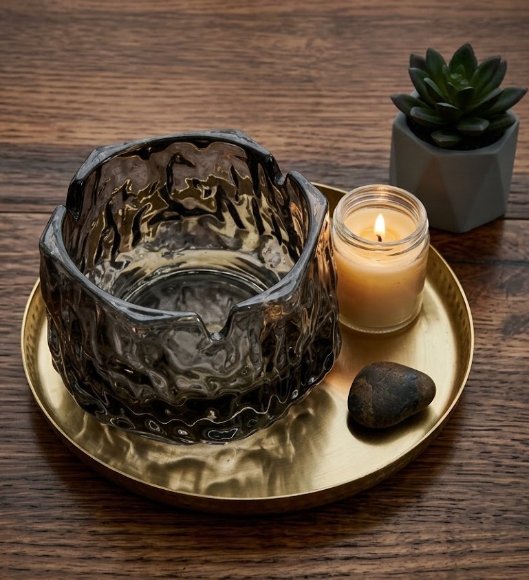 A stylish decorative glass bowl designed with an organic, textured silhouette that adds depth and character to any space. The irregular edge and dark smoky finish create a bold yet elegant look, making it perfect for use as a centerpiece, a small serving bowl, or a decorative accent on coffee tables and consoles.