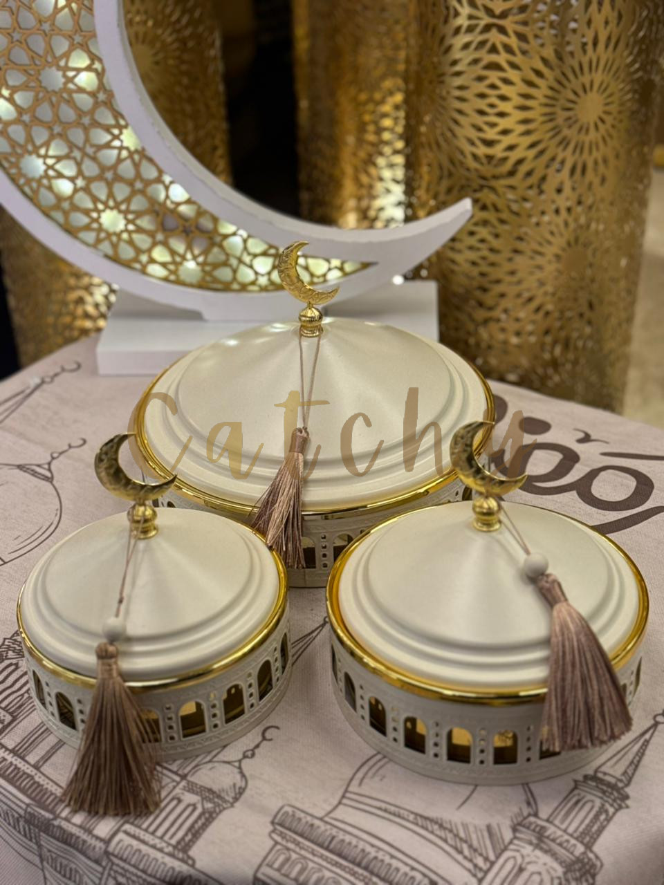 An elegant Ramadan dates plate set inspired by traditional Islamic architecture, featuring beautifully shaped bowls with arched window detailing and topped with white lids crowned with gold crescent moon finials. The soft white and gold color palette creates a refined and festive look, making this set perfect for serving dates, sweets, or nuts during Iftar and Eid gatherings.