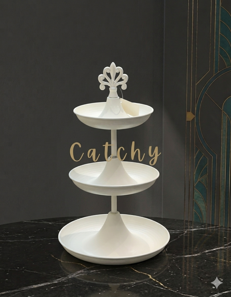 An elegant three-tier serving stand designed with soft, flowing curves and a clean white finish. Featuring graduated plates stacked vertically and topped with a decorative handle, this piece is perfect for serving desserts, pastries, fruits, or small treats. Its minimalist design makes it ideal for both everyday use and special gatherings, while also serving as a stylish decorative accent on tables or counters.