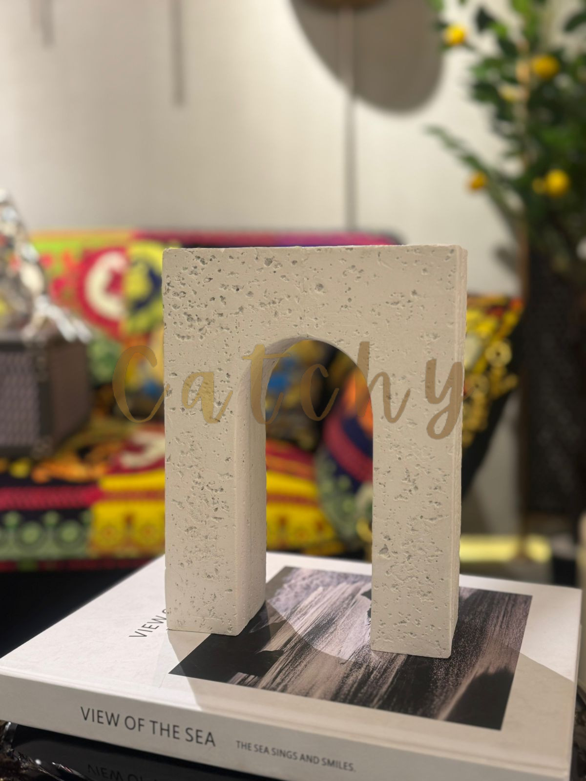 Minimalist stone-look sculpture featuring a modern arched design. Its textured surface and neutral tone bring a sense of balance and sophistication to any contemporary or Scandinavian-style interior. Perfect for coffee tables, consoles, or open shelving.