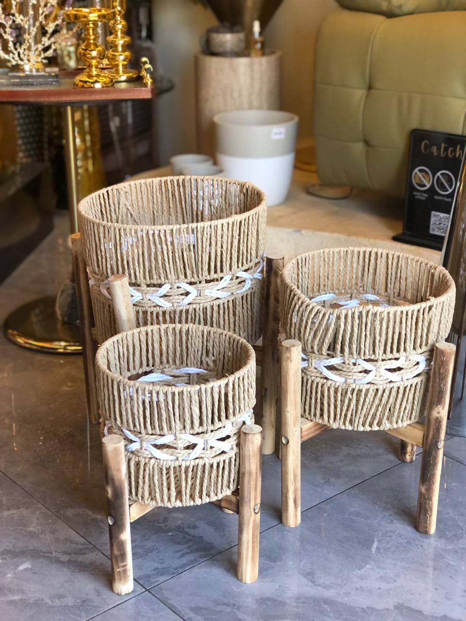 The raised wooden stand enhances its presence, making it perfect as a stylish laundry basket, plant holder, or decorative storage piece. Its earthy tones and natural materials blend effortlessly with bohoo, Scandinavian, and modern interiors.
