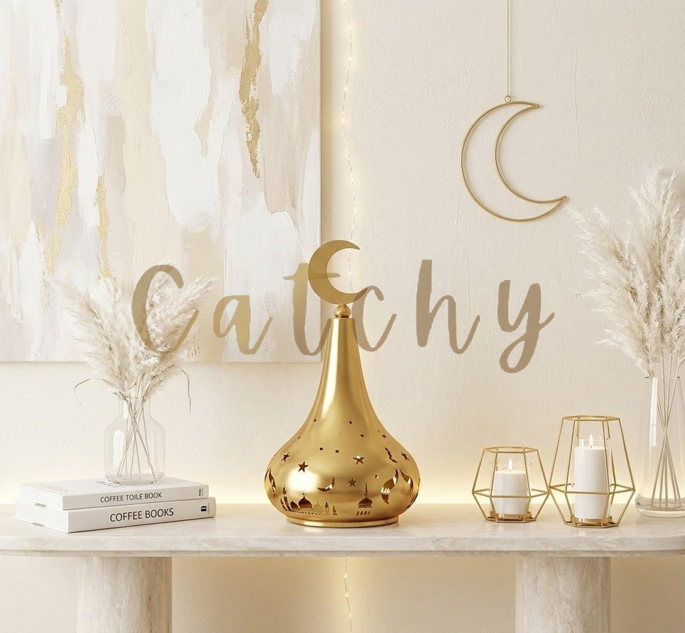 beautifully designed Ramadan dates plate featuring a decorative crescent moon frame adorned with star and mosque silhouettes. The set includes two textured gold bowls, perfect for serving dates, nuts, or sweets during Iftar. Finished in an elegant gold tone, this piece doubles as a functional serving set and a festive decorative accent for your Ramadan table.
