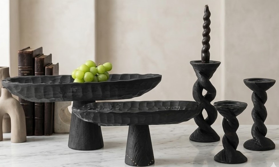 This modern set crafted from matte textured resin includes artistic bowls and twisted candle holders — perfect for creating a stylish, earthy vibe.