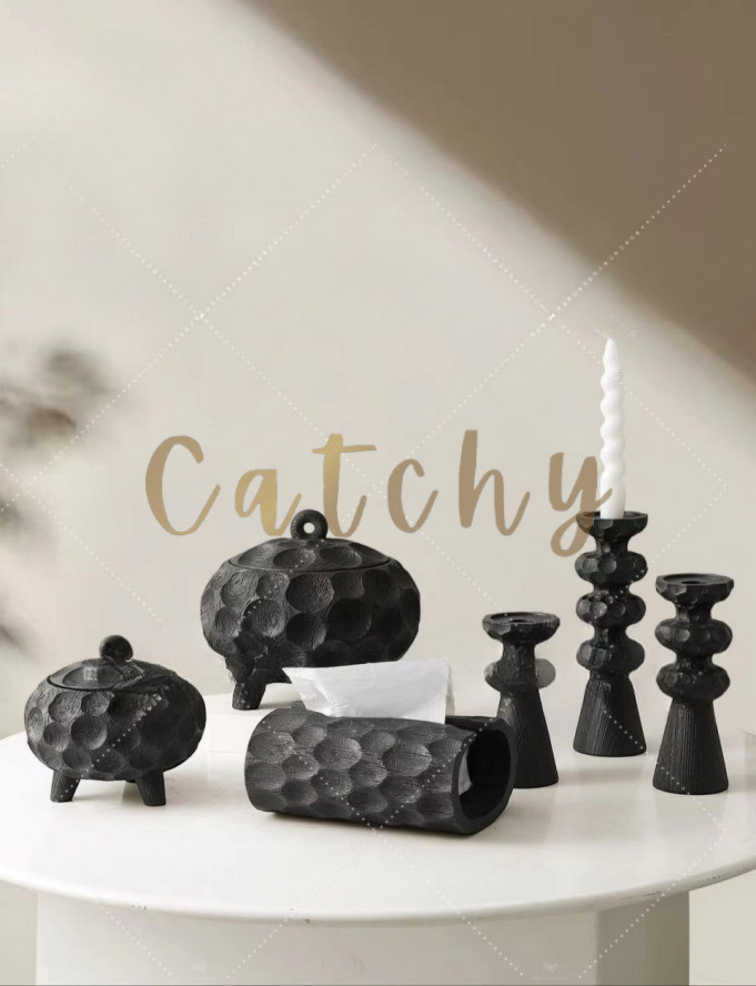 This matching set crafted from textured matte resin includes elegant candle holders, a tissue box and a candy jar —