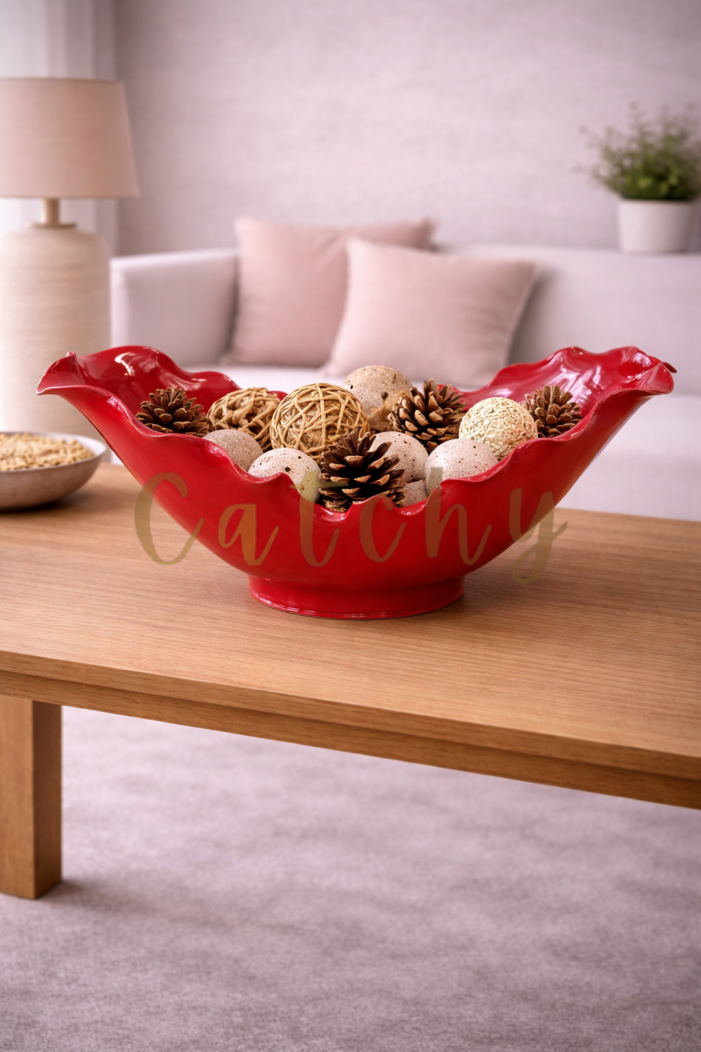 A glossy red ceramic display bowl styled as a statement centerpiece, adding bold color and modern elegance to any table or console.