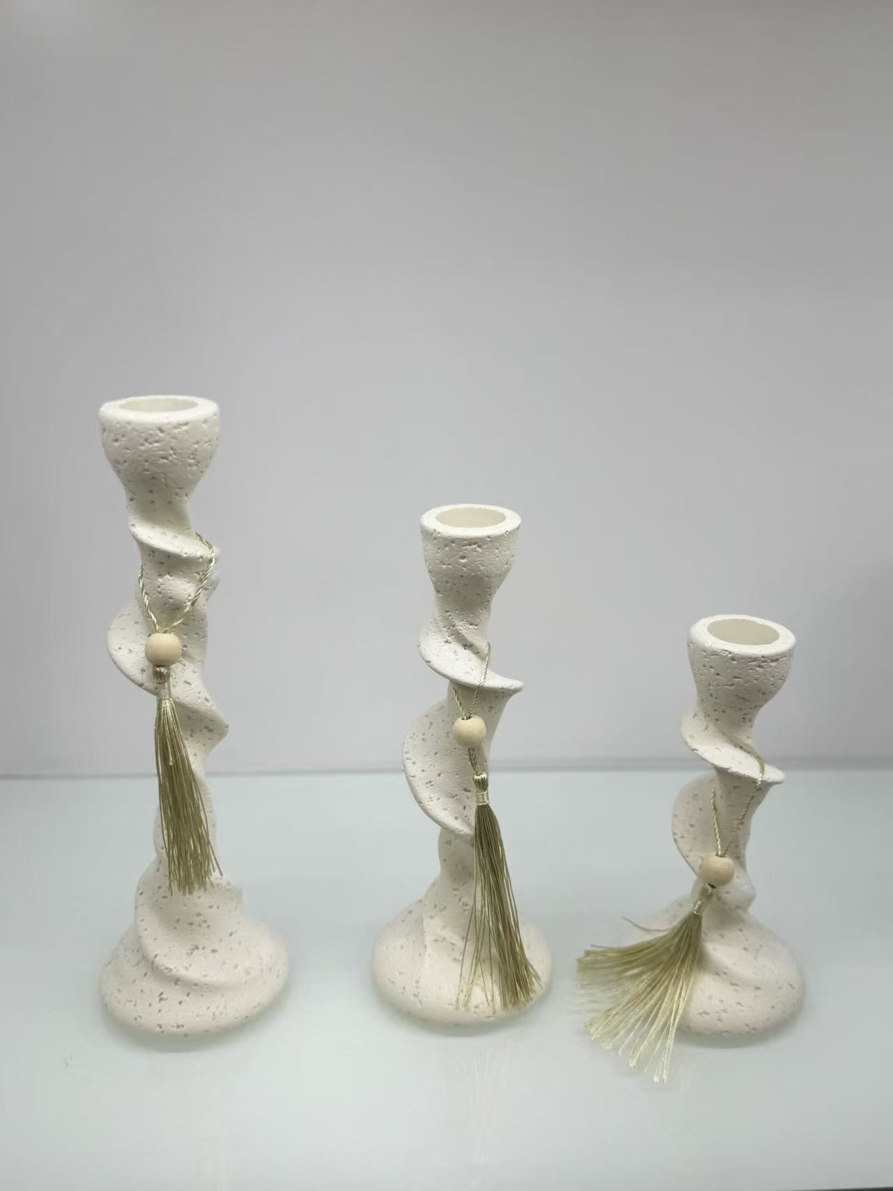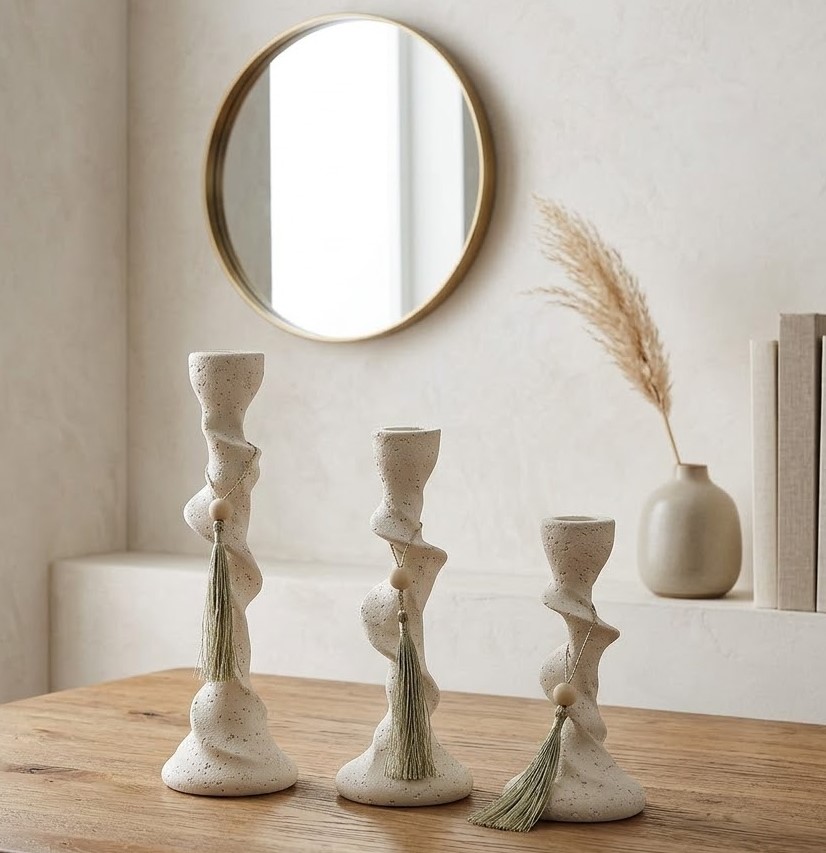 A charming candle holder of decorative pieces designed with soft, sculptural forms and a natural stone-inspired finish. Featuring gently rounded silhouettes in varied sizes, these pieces can be styled as candle holders or small decorative vases. Their neutral tone and subtle texture make them perfect for modern, minimalist, and spa-inspired interiors.