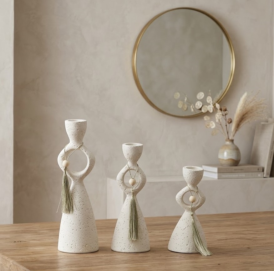 A charming candle holder of decorative pieces designed with soft, sculptural forms and a natural stone-inspired finish. Featuring gently rounded silhouettes in varied sizes, these pieces can be styled as candle holders or small decorative vases. Their neutral tone and subtle texture make them perfect for modern, minimalist, and spa-inspired interiors.