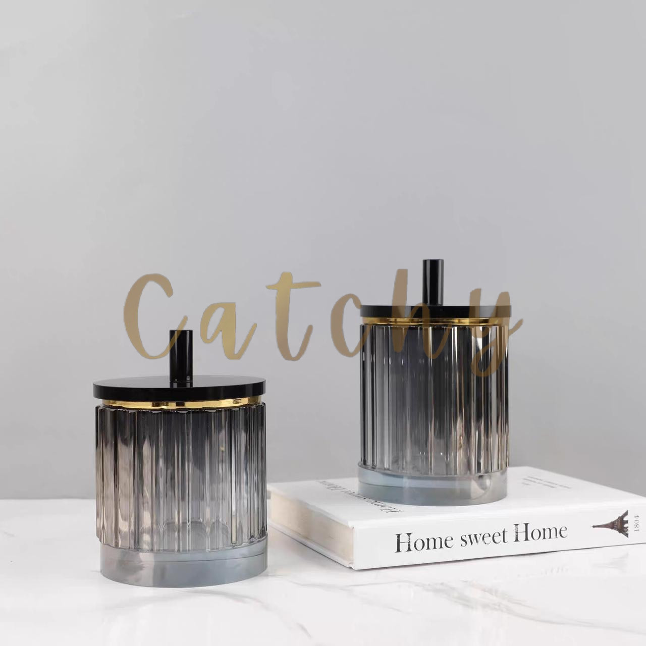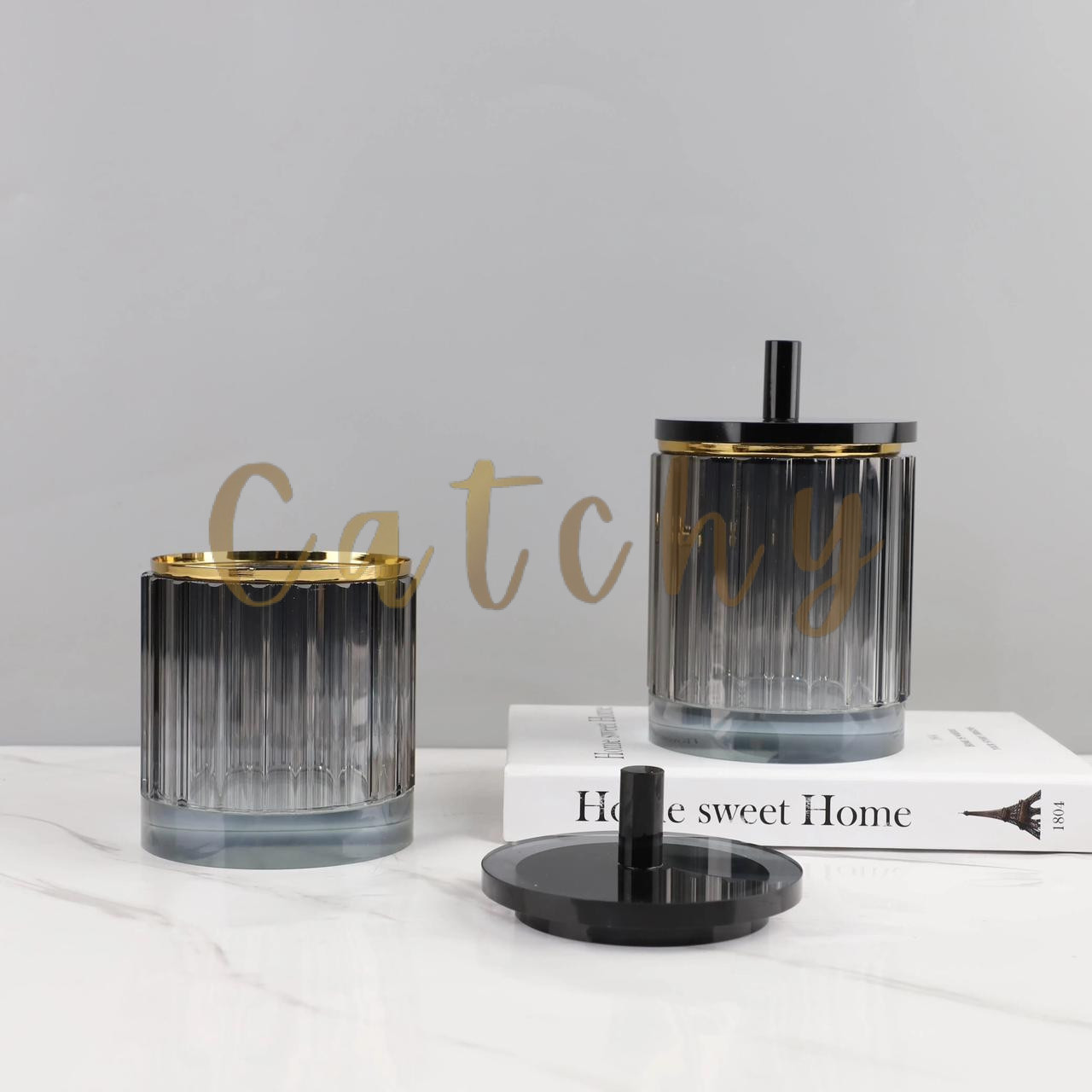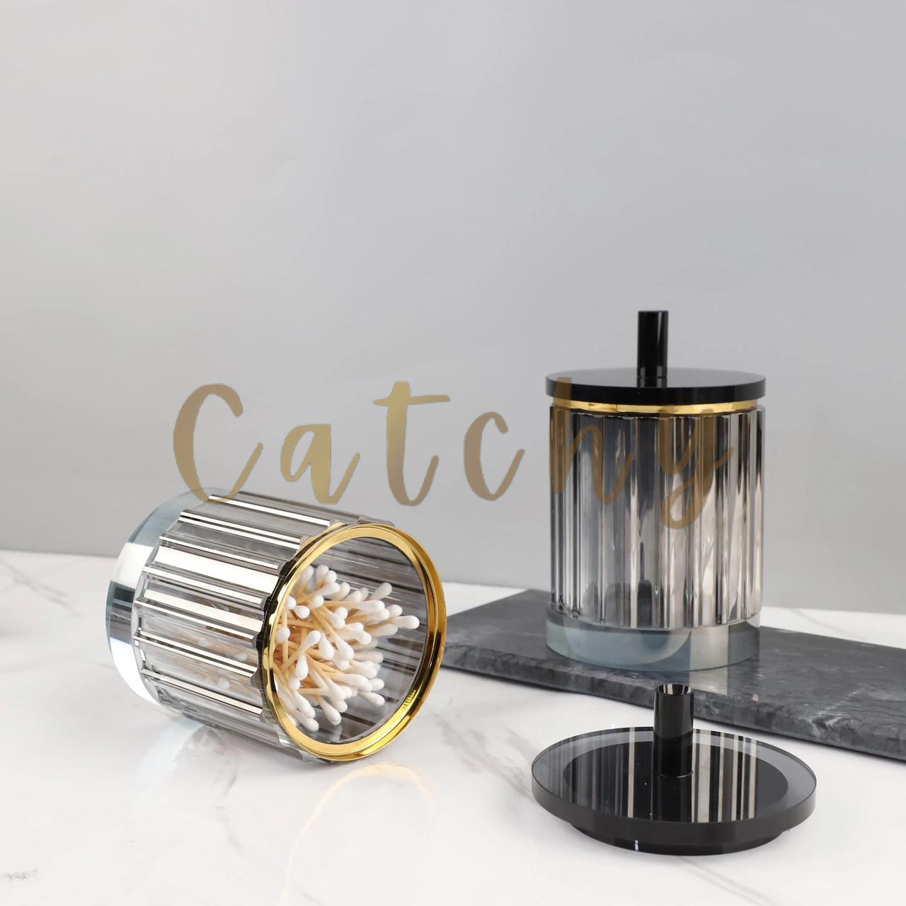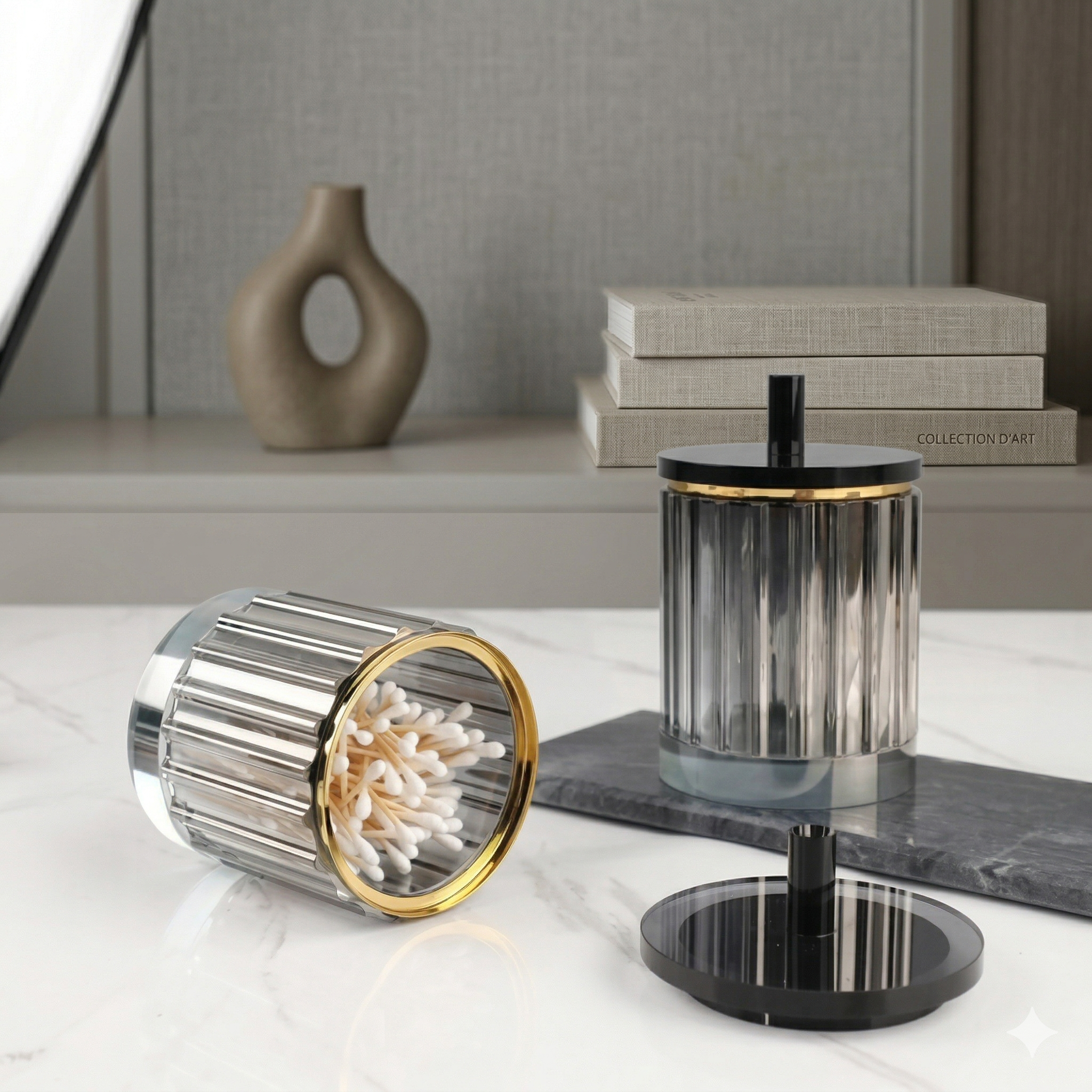 Designed with a chic gold-rim finish and a sleek lid to keep your cotton pads, cotton swabs