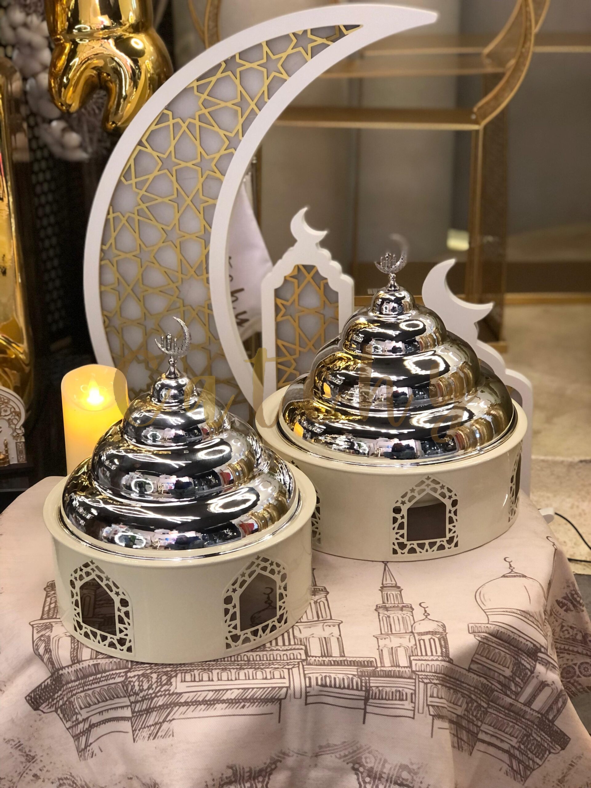 A refined Ramadan censer inspired by traditional architectural domes, featuring layered silver-toned accents and elegant arched cut-out details. Its classic silhouette and soft neutral finish make it a timeless decorative piece for festive and everyday interiors. Materials:
