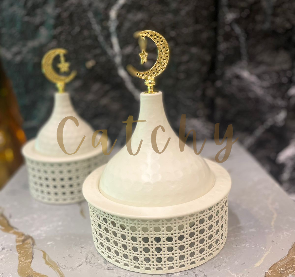 Ramadan Dates Decorative Container – Crescent Moon Accent An elegant Ramadan dates decoration designed with a textured dome lid topped with a gold crescent and star detail. The perforated metal base adds a light, refined touch while allowing subtle visual depth. Perfect for presenting dates during iftar or as a festive tabletop accent, this piece blends traditional Ramadan symbolism with a modern, luxurious style. Material: Metal Style: Ramadan / Modern Islamic décor Use: Dates container / decorative centerpiece |