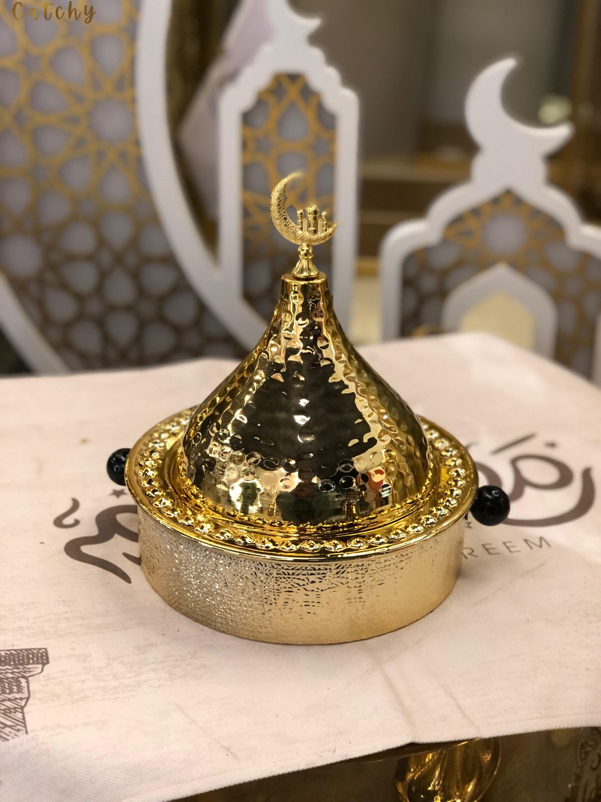 Ramadan Dates Decorative Container – Gold Calligraphy Dome