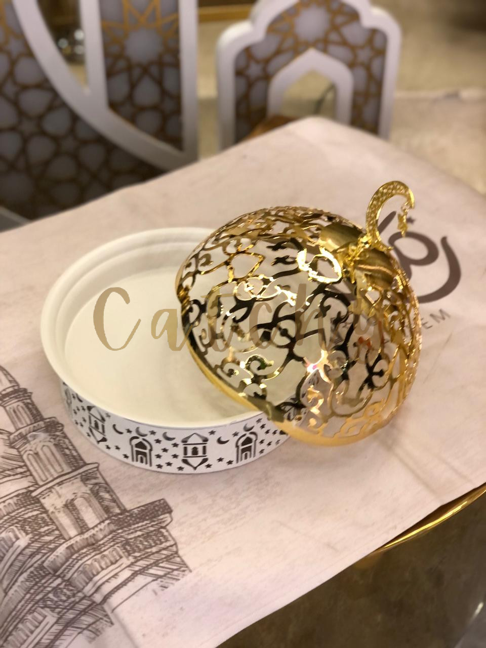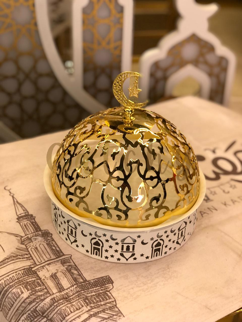 Ramadan Dates Decorative Container – Gold Calligraphy Dome