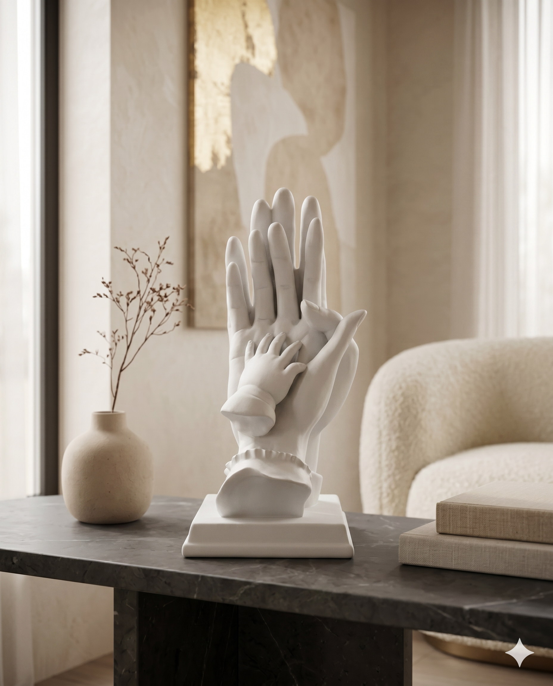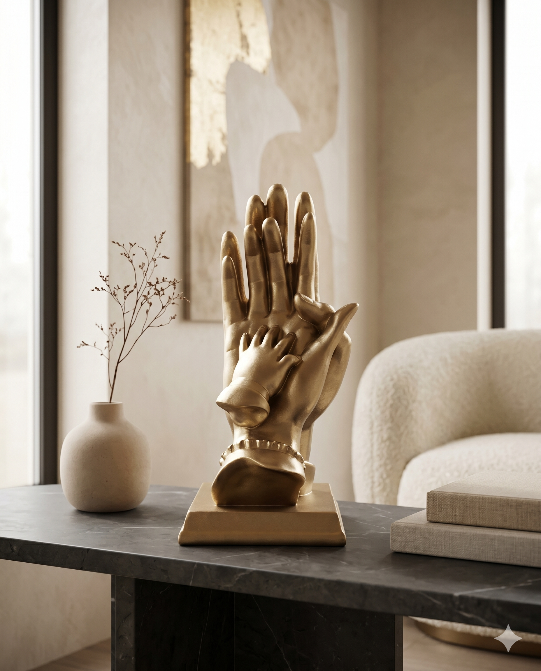 Crafted with artistic precision, this striking decor piece features an intricately sculpted adult hand, strong and sheltering, cradling a delicate child’s hand. Both are nested vertically within a larger sculpted form, creating a vertical stacked arrangement that represents legacy, protection, and unconditional love.