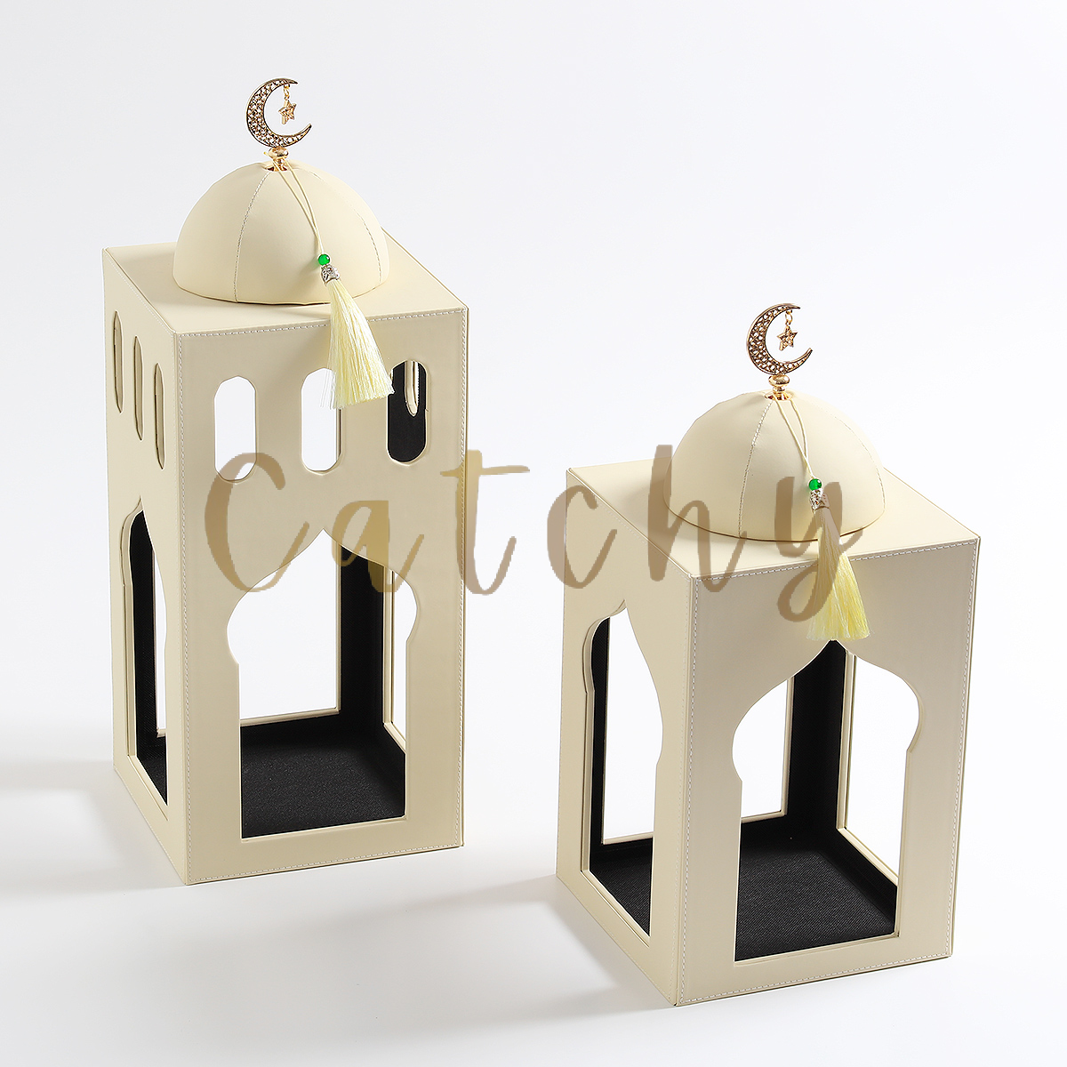 - Traditional Dome Lanterns: These cylindrical lanterns are constructed from white powder-coated stamped metal. They feature a polished gold dome topped with a mosque silhouette and crescent moon finial.
