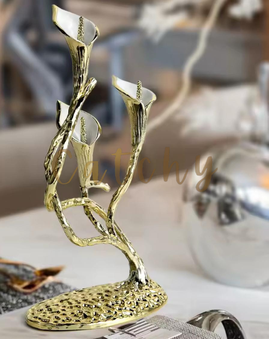 Crafted from gold-finished metal with white details, this piece adds a refined artistic touch to consoles, shelves, and display areas.