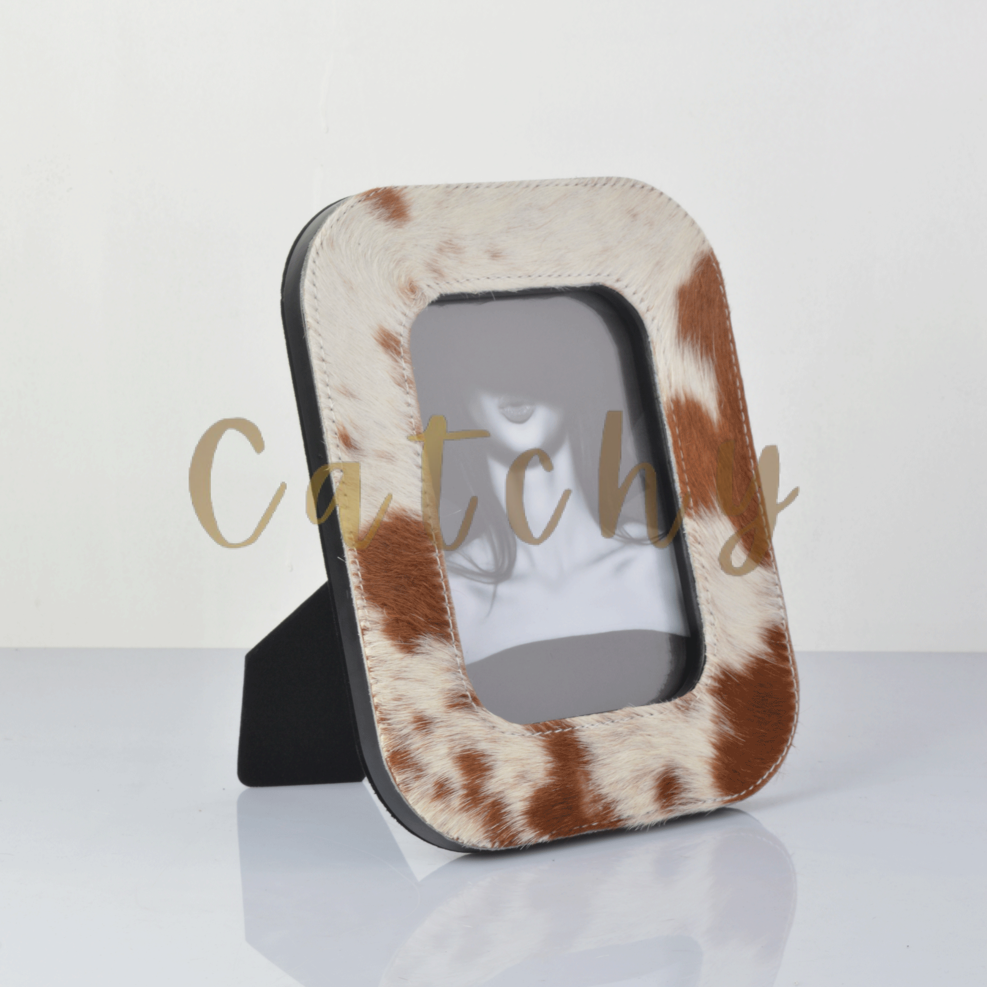 A simple photo frame wrapped in natural hair-on-hide leather.