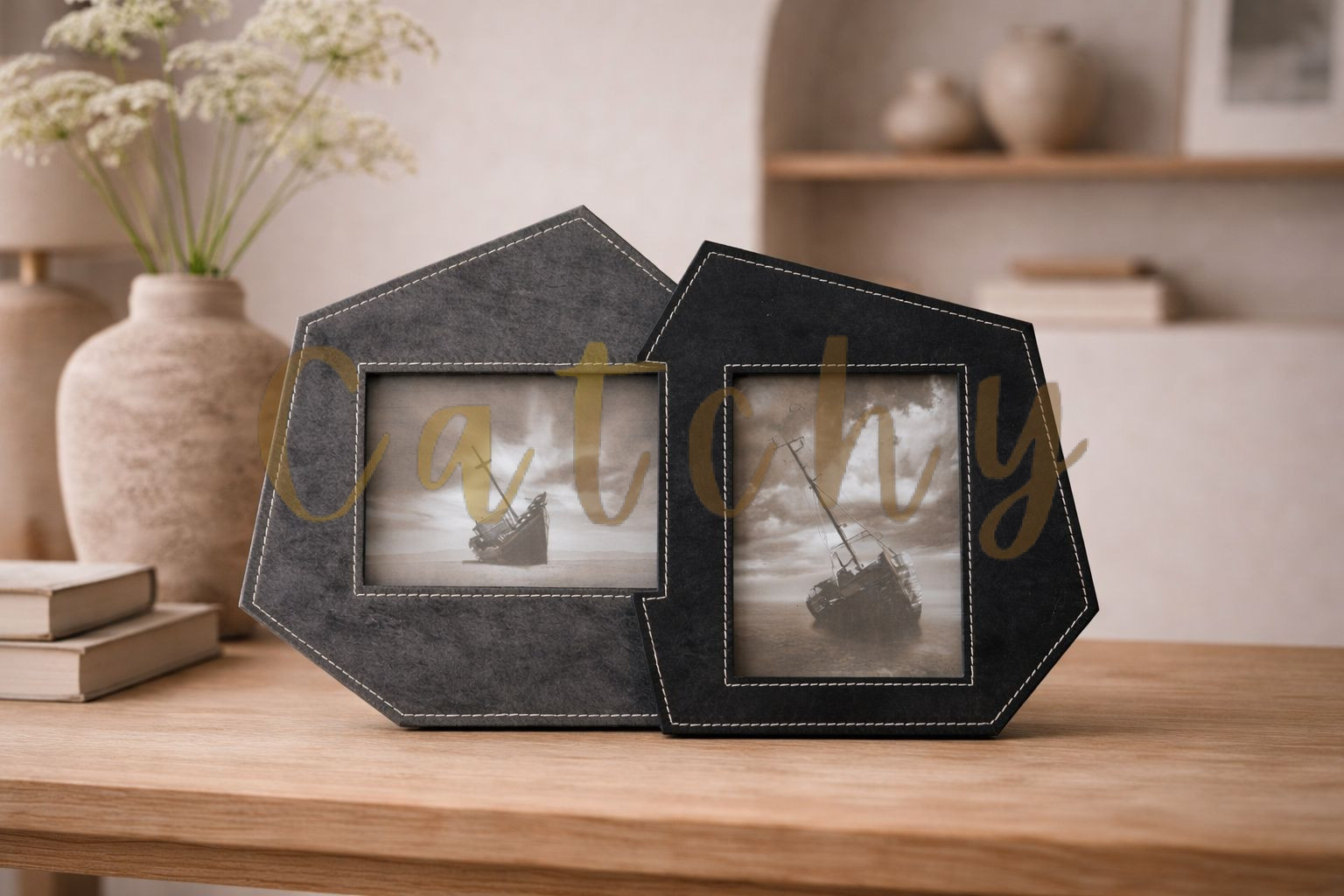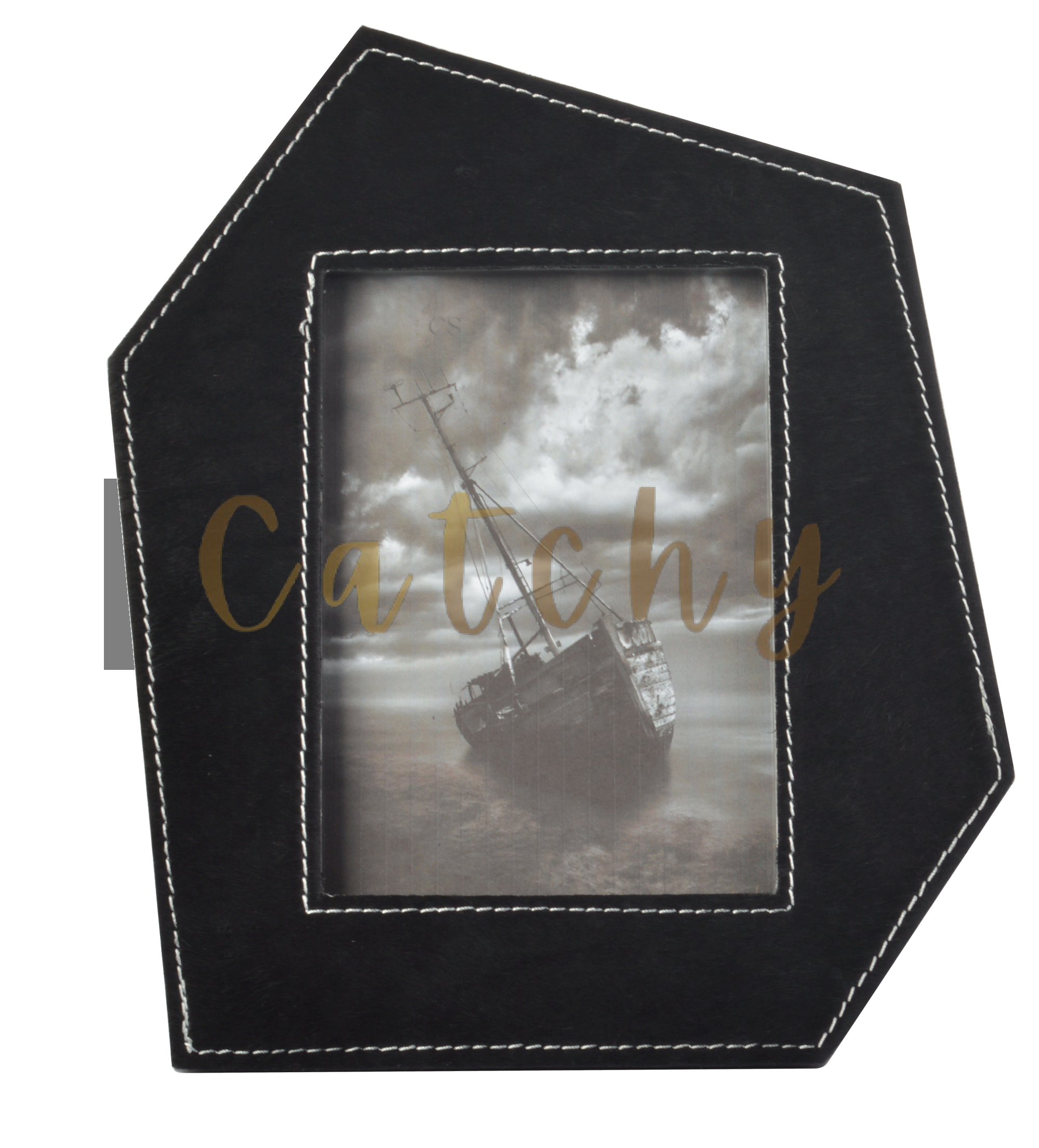 A simple photo frame crafted from black leather with clean stitching and a geometric shape.
