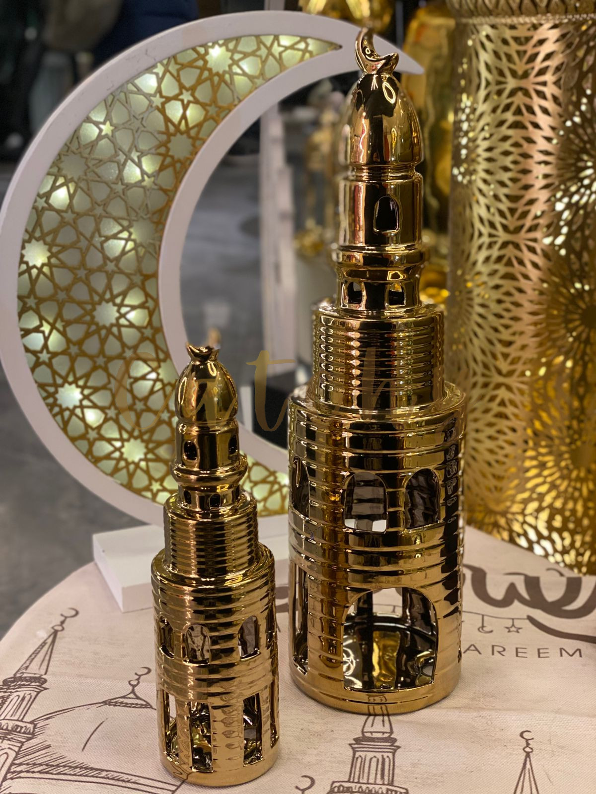 luxurious Ramadan lantern inspired by iconic Islamic minaret architecture, designed with refined details and a striking gold finish. The lantern features layered tower elements, arched window cut-outs, and a crescent moon finial, creating a warm and elegant glow when illuminated. Perfect for adding a rich, festive ambiance to Ramadan and Eid décor, whether displayed individually or as a coordinated set.