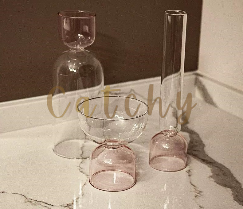 A chic and delicate glassware set in a soft blush pink tone, featuring a modern teapot and matching cups with clean, minimalist lines. Perfect for elevating your tea moments or displaying as an artistic accent in open shelving or serving trays.