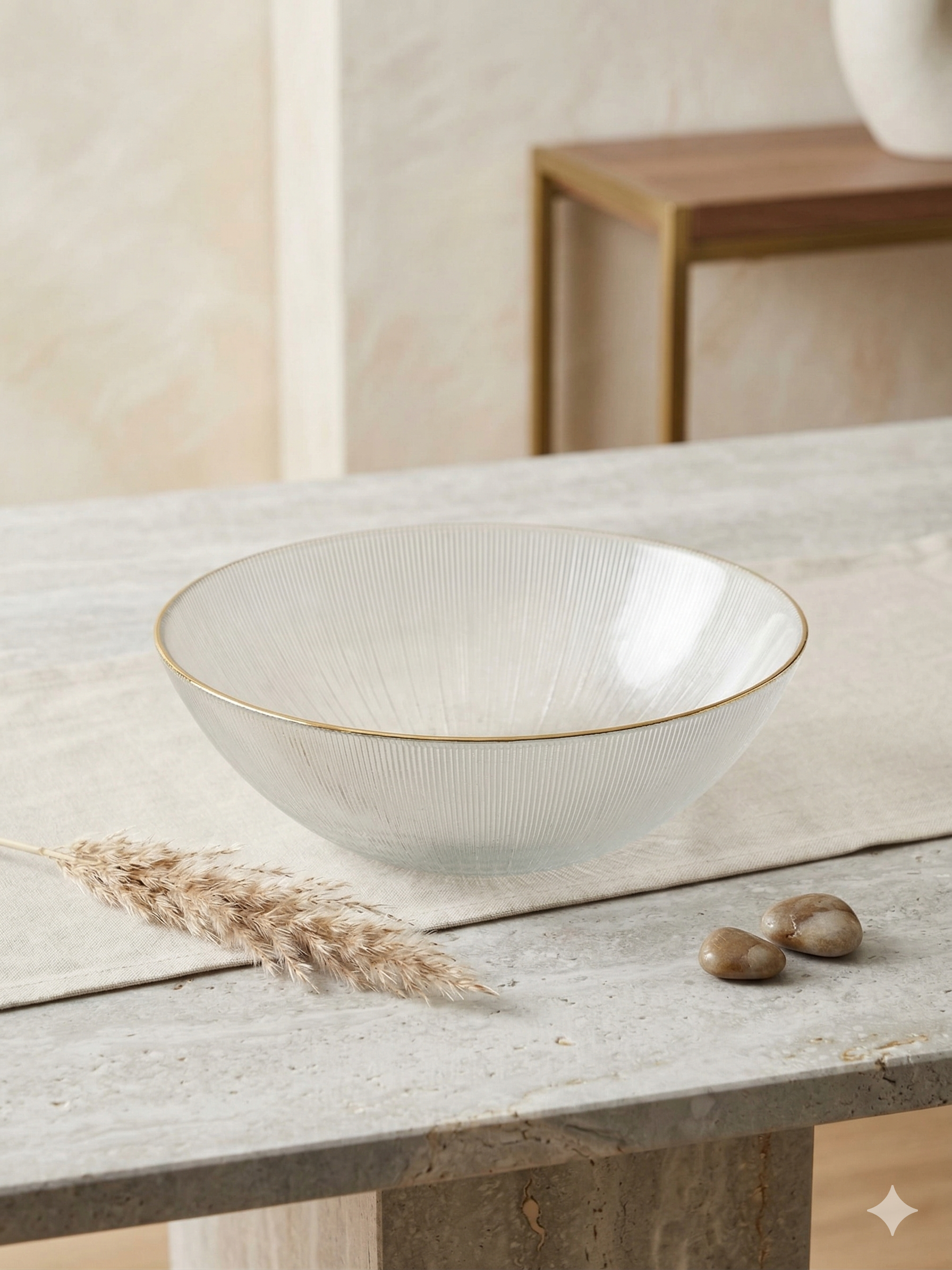 This plate features a wide, shallow silhouette with a softly curved rim and a beautifully textured surface. The transparent glass design reveals subtle concentric detailing, creating depth and dimension while maintaining a light, airy feel. Its generous diameter and elegant slope make it ideal for statement plating, enhancing food presentation with a modern yet sophisticated touch.