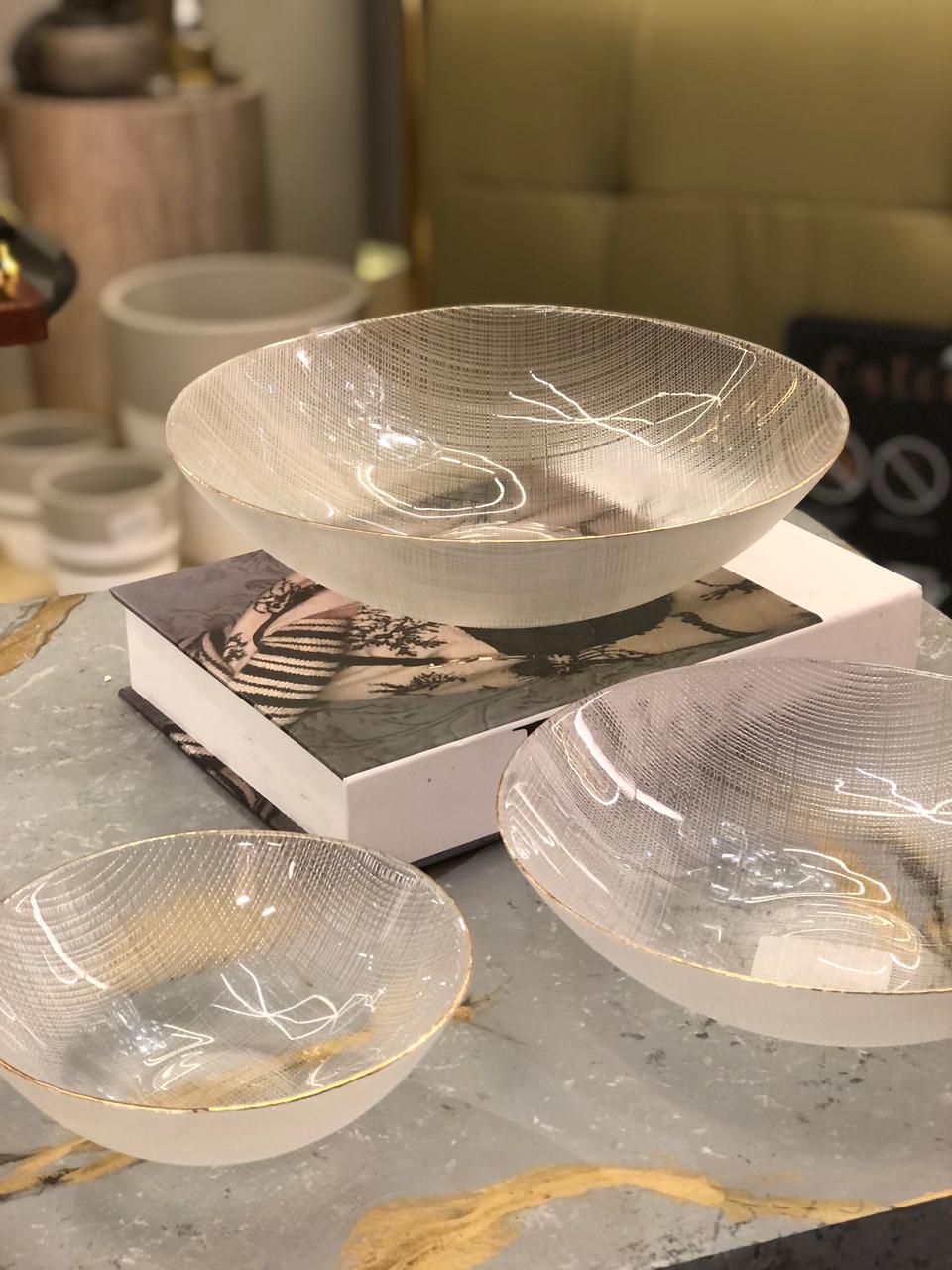 This plate features a wide, shallow silhouette with a softly curved rim and a beautifully textured surface. The transparent glass design reveals subtle concentric detailing, creating depth and dimension while maintaining a light, airy feel. Its generous diameter and elegant slope make it ideal for statement plating, enhancing food presentation with a modern yet sophisticated touch.