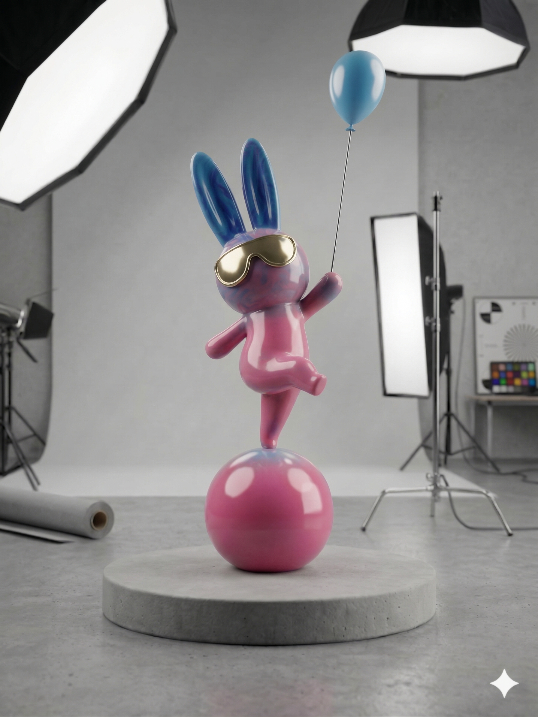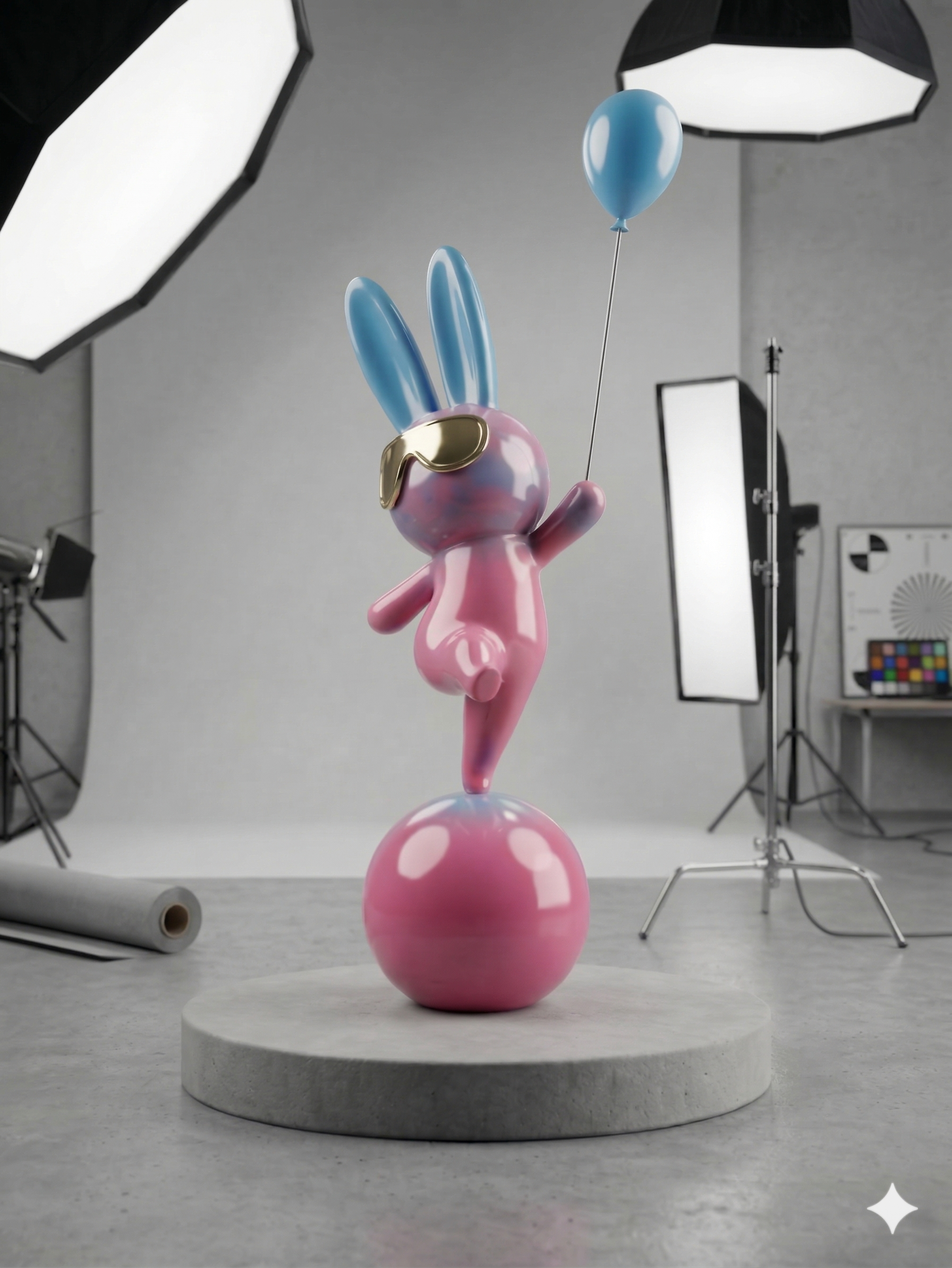 Elevate your space with this whimsical and fashion-forward decorative sculpture. A playful rabbit figure is depicted in a joyful pose, balancing on a spheres and holding a blue balloon. This unique piece combines pop art elements with a high-end designer aesthetic, perfect for adding a touch of humor and style to any modern home interior