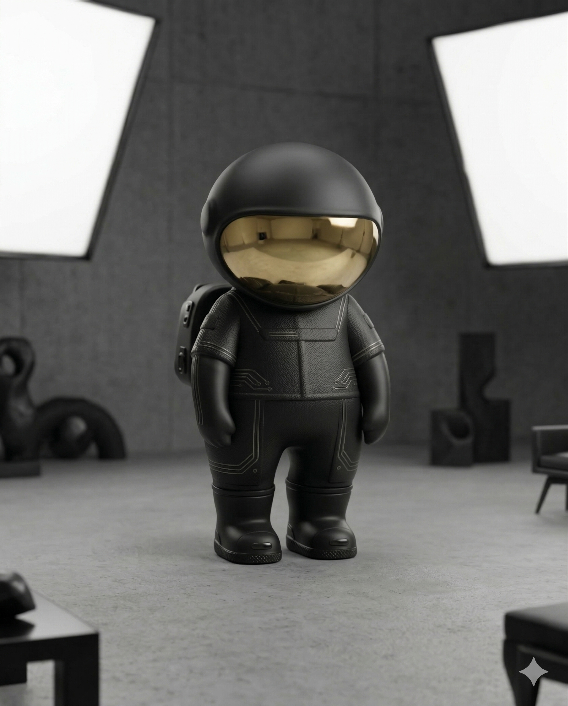 Elevate your space with this striking astronaut sculpture, a bold fusion of futuristic design and modern elegance. Crafted with a sleek matte black finish and a reflective gold visor, this statement piece instantly draws attention while adding a sophisticated, artistic touch to any interior.