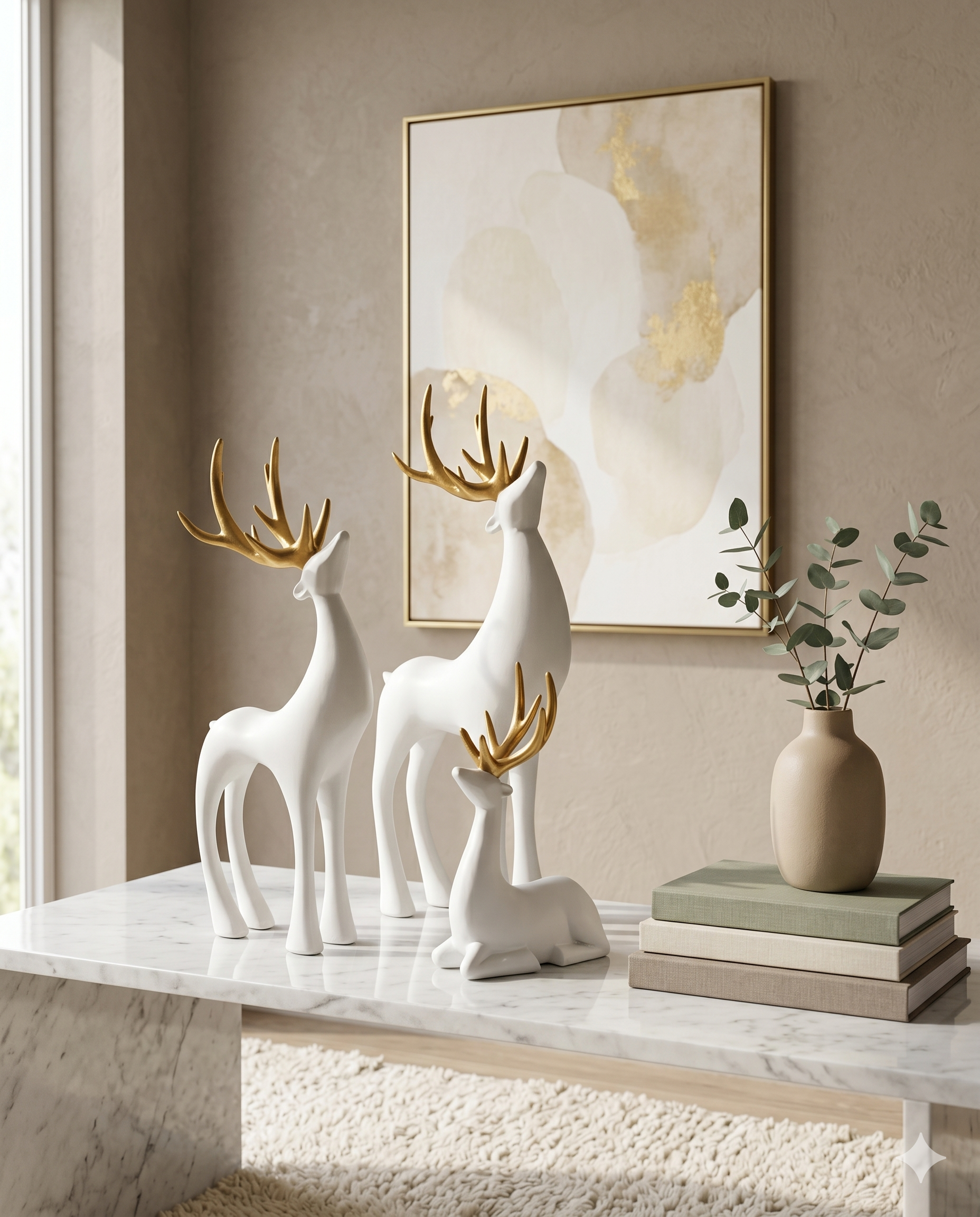 Transform your console table, mantel, or desk into a curated expression of modern majesty with this striking set of three deer figurines. This collection of stylized stags is rendered in a semi-matte obsidian black finish, creating a sleek, contemporary form that demands attention.