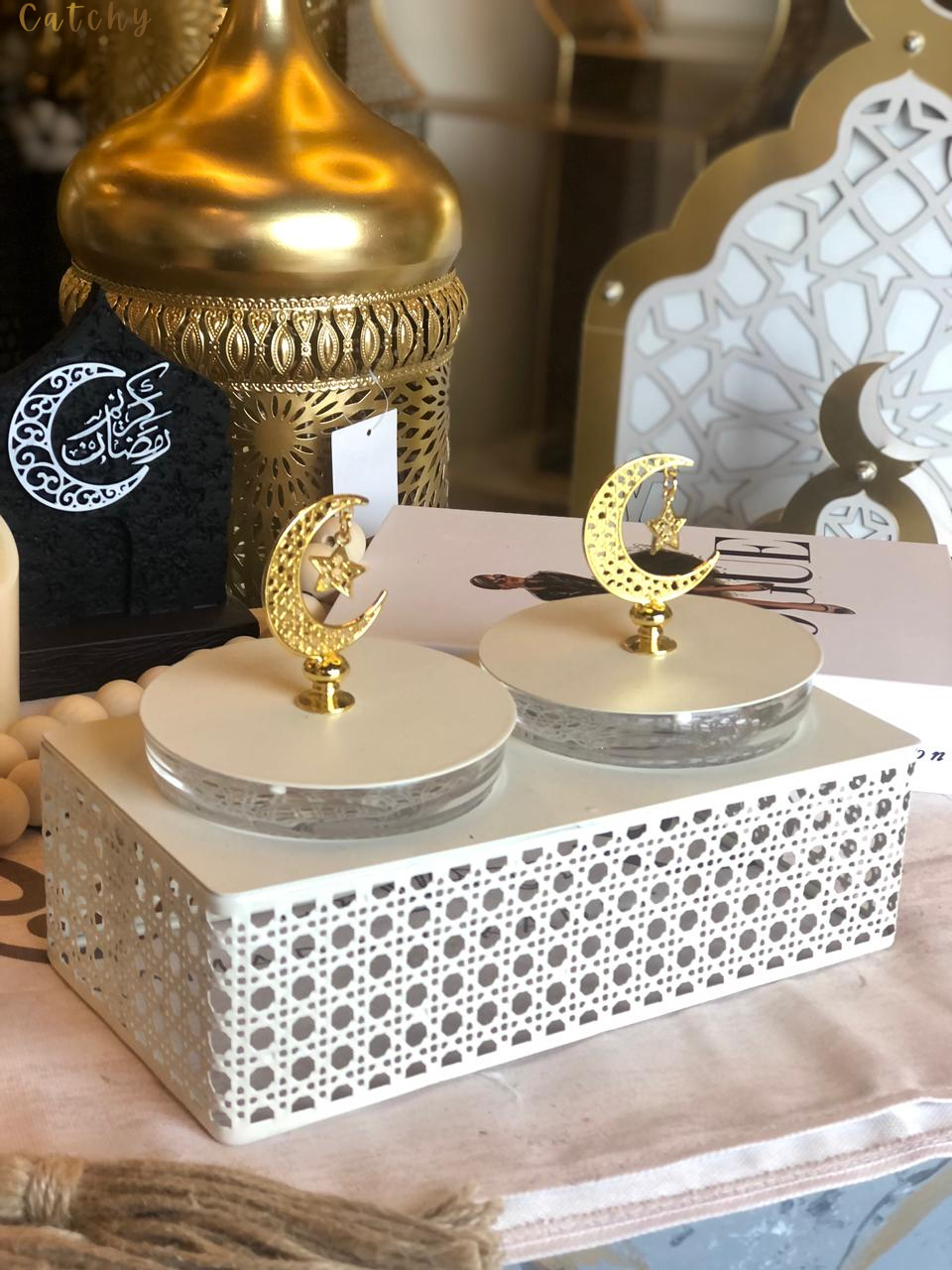 Its most striking feature is the pair of oversized, arched handles. These handles are densely embellished with shimmering beads or crystals, providing a high-end, luxurious grip that makes the tray a standout centerpiece for serving dates, sweets, or tea during Iftar or Suhoor.
