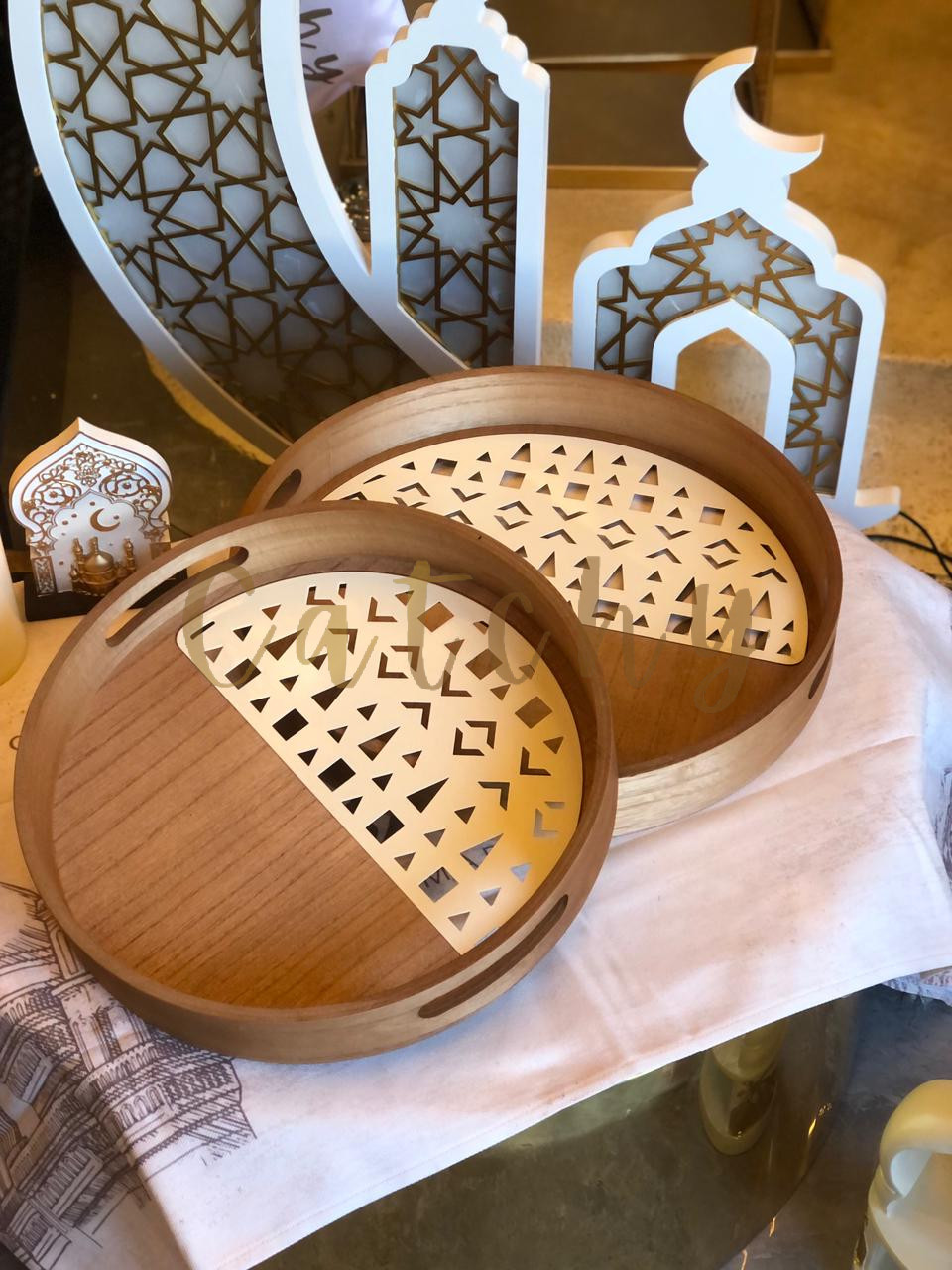 A stylish set of round serving trays combining warm wood tones with elegant Islamic-inspired cut-out metal detailing. The contrasting materials create a refined yet inviting look, making the trays both functional and decorative.