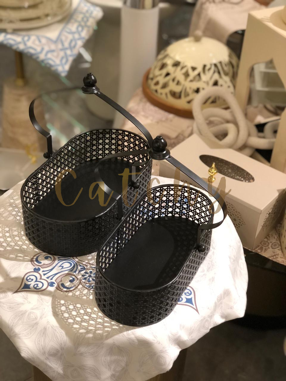 A refined Ramadan tray designed with a crescent-inspired metal handle and delicate perforated detailing. Crafted from durable metal with an elegant matte finish, this tray blends functionality with festive charm. Ideal for serving dates, sweets, or as a decorative centerpiece during Ramadan gatherings, it adds a graceful and modern touch to any table or console.