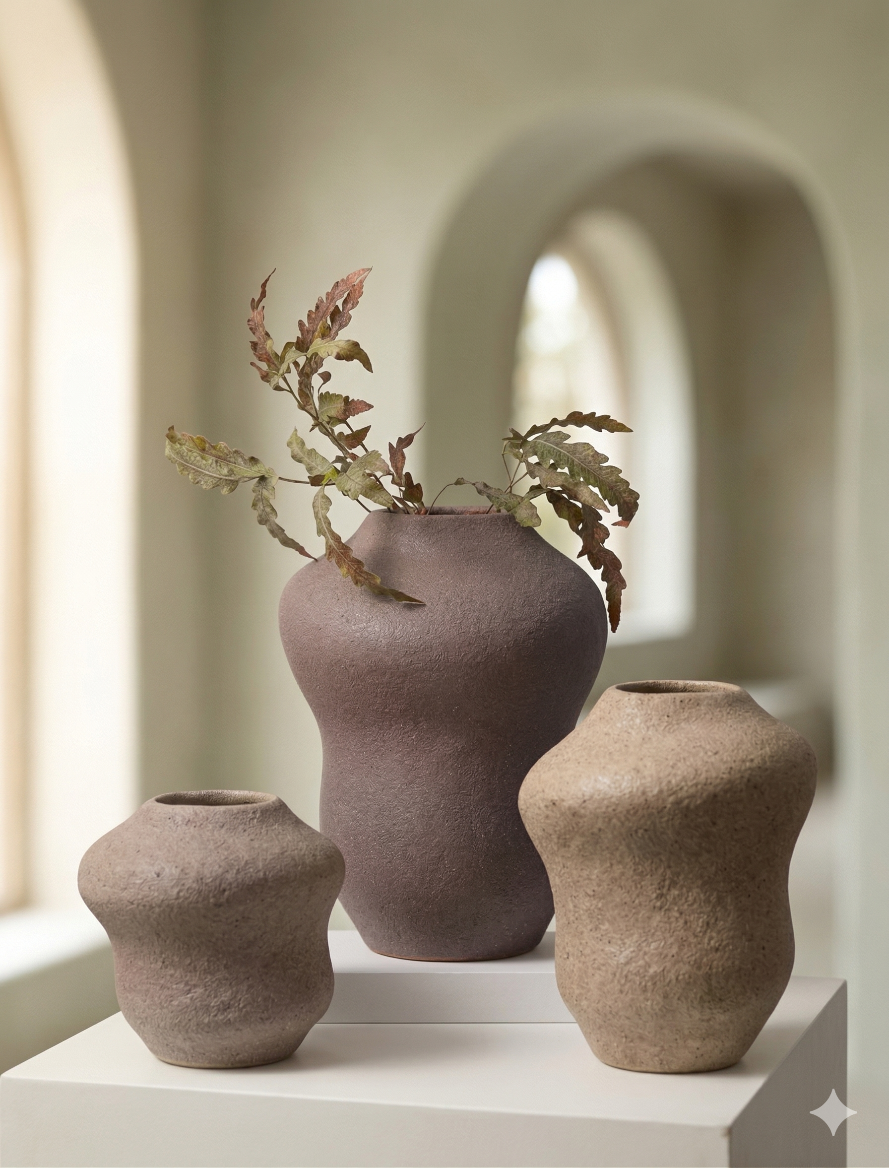 A timeless trio of ceramic vases crafted with soft rounded silhouettes and delicate horizontal texturing that adds subtle depth and refinement. Finished in an elegant matte white tone, each piece embodies understated luxury and modern simplicity.